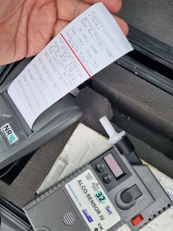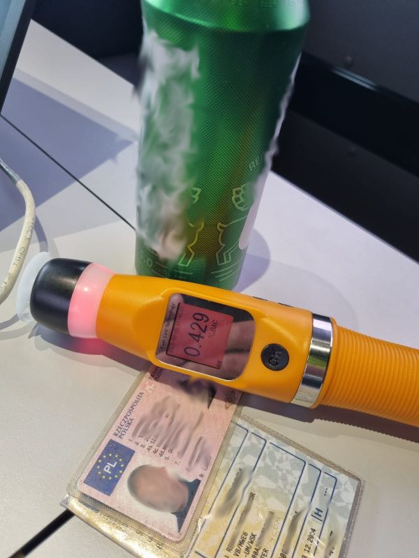 Na miejsce wezwano patrol Policji, który przeprowadził dalsze badania. Ostateczny wynik to 0,379 mg/l alkoholu.