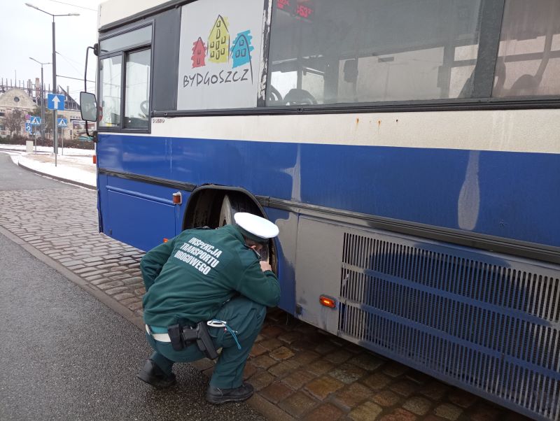 W dniu 18 stycznia na jednej z bydgoskich ulic inspektorzy skontrolowali nietypowy autobus, którym wykonywany był przewóz osób w ramach jednej z linii regularnych. Stan pojazdu, zarejestrowanego jako zabytkowy pozostawiał wiele do życzenia. Światła STOP świeciły się w trybie ciągłym, niezależnie hamowania pojazdem. Niesprawne były też światła cofania, jeden z kierunkowskazów oraz część świateł obrysowych zamontowanych na autobusie. Do tego kilka elementów oświetlenia była uszkodzona lub nieprawidłowo zamontowana. Koło na trzeciej osi było zablokowane i tylko „ślizgało się” po nawierzchni. Również wewnątrz pojazdu stwierdzono nieprawidłowości, gdyż jeden z foteli pozbawiony był siedziska.