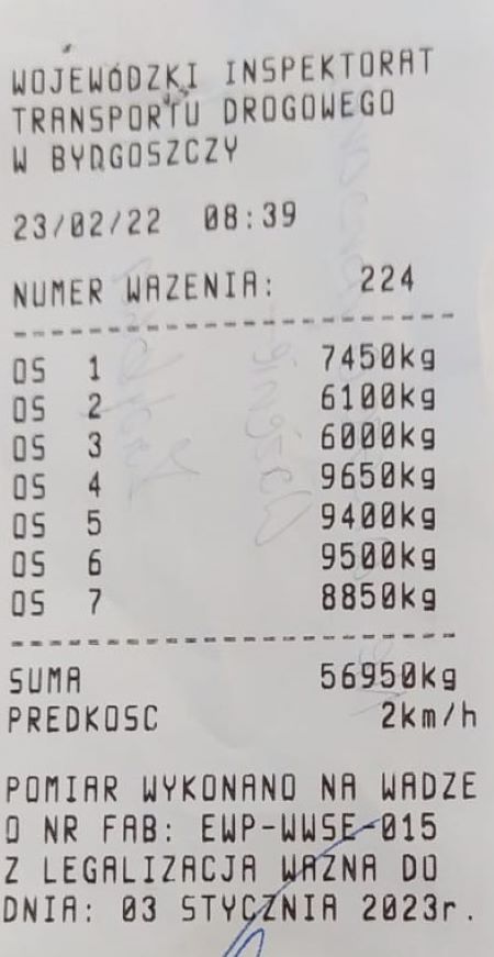 Dodatkowo, pomiary masy rzeczywistej ujawniły przekroczenie dopuszczalnej masy całkowitej pojazdu wynoszącej 40 ton, o ponad 42% - pojazd ważył niespełna 57 ton. Dopuszczalne naciski osi w kontrolowanej naczepie również zostały przekroczone.