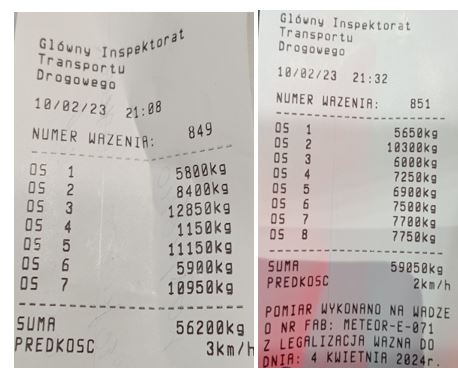 W dniu 10 lutego br., na drodze krajowej nr 62 i autostradzie A1, inspektorzy z włocławskiego oddziału kujawsko-pomorskiej Inspekcji Transportu Drogowego zatrzymali mobilnie do kontroli dwa pojazdy członowe, którymi wykonywany był transport drogowy dwóch 20-stopowych kontenerów do portu w Gdyni. Ważenie pojazdów wykazało, że masy rzeczywiste pojazdów wynosiły odpowiednio 56,2 tony oraz 59 ton.
