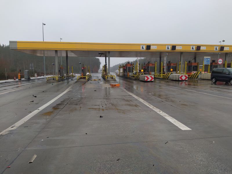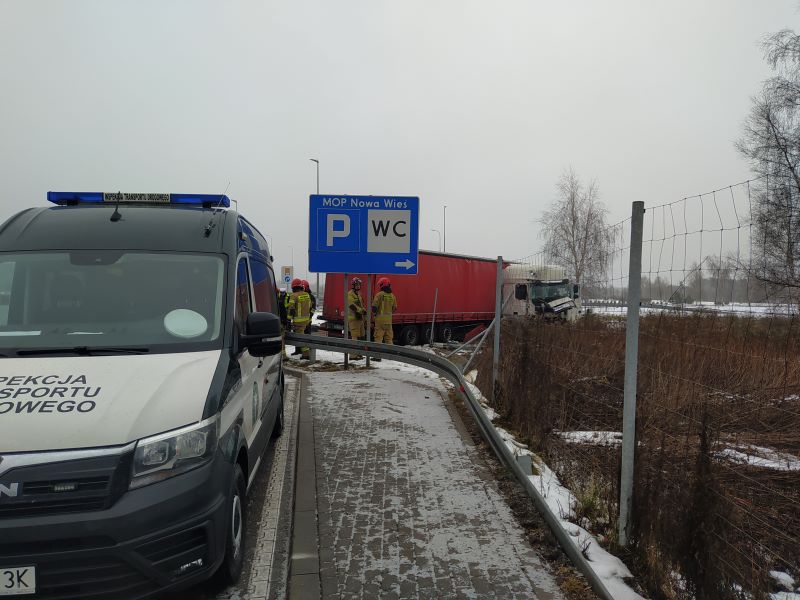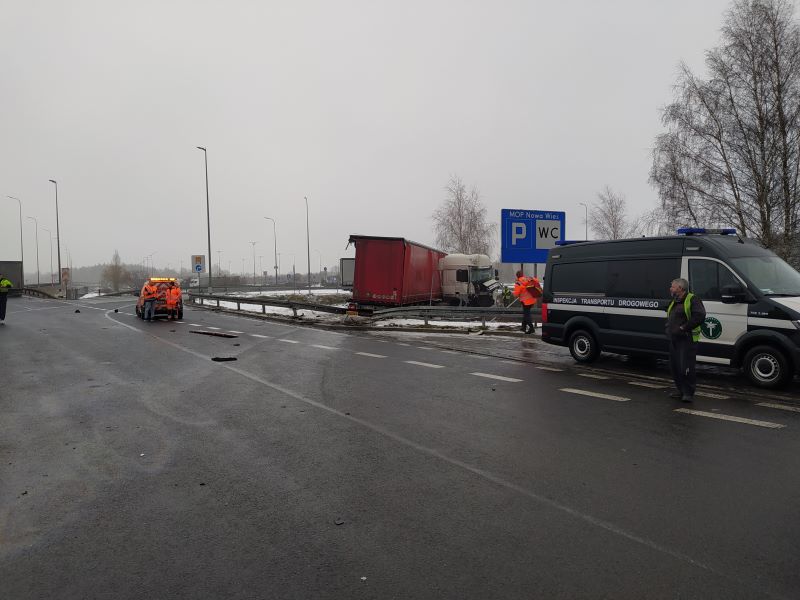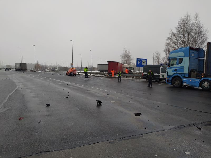 W zdarzeniu uczestniczyły dwa pojazdy członowe. Jak wynika ze wstępnych ustaleń kierujący pojazdem ciężarowym nie dostosował prędkości do warunków ruchu, w wyniku czego najechał na barierki ochronne oraz biletomat, a następnie uderzył w naczepę poprzedzającego go pojazdu ciężarowego.