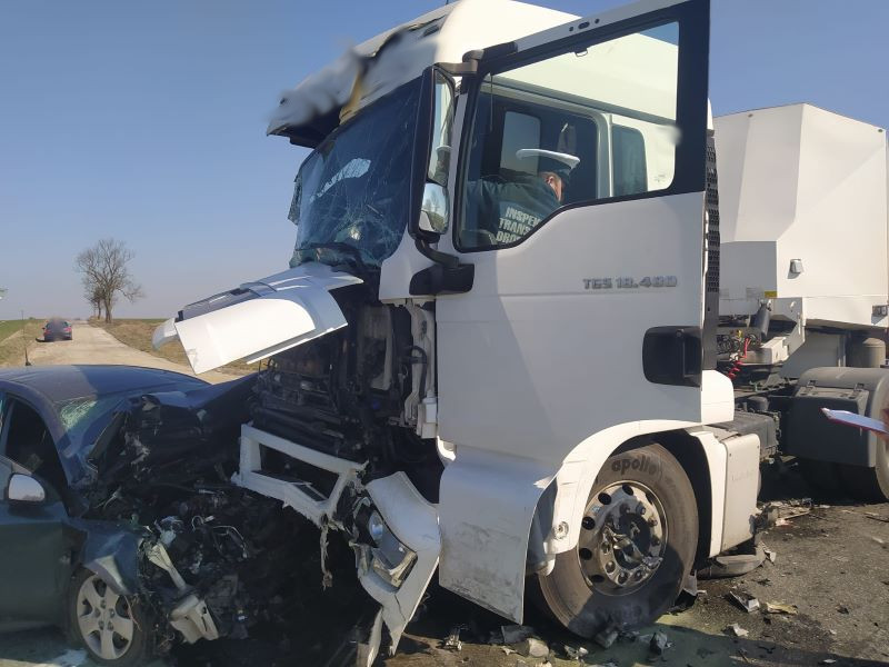 Inspektorzy z WITD w Bydgoszczy wezwani do wypadku drogowego z udziałem dwóch pojazdów ciężarowych i samochodu osobowego na krajowej 10.