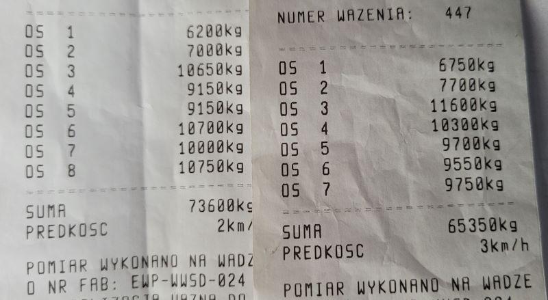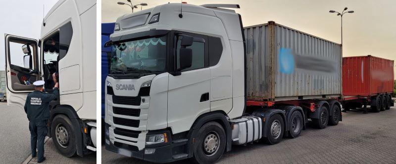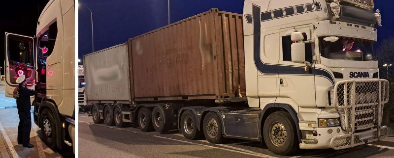 W tym samym czasie został zatrzymany do kontroli drugi podobny zestaw w dwoma kontenerami, w których przewożony był ryż w workach. Według listów przewozowych masa ładunków w kontenerach wynosiła 43000 kg. Po zważeniu okazało się, że ten zestaw również jest za ciężki. Waga wskazała rzeczywista masę całkowita zespołu pojazdów 65350 kg. Analiza czasu pracy kierowcy z ostatnich 28 dni wykazała, że wielokrotnie naruszył on dopuszczalne normy prowadzenia pojazdów, przerw w prowadzeniu i odpoczynków. Ta kontrola również zakończyła się nałożeniem na kierowcę mandatów karnych oraz wszczęciem postępowań administracyjnych o nałożenie kar pieniężnych wobec przewoźnika.