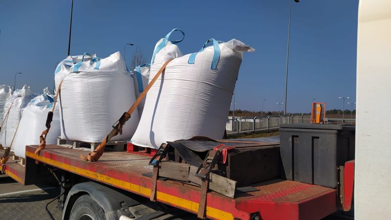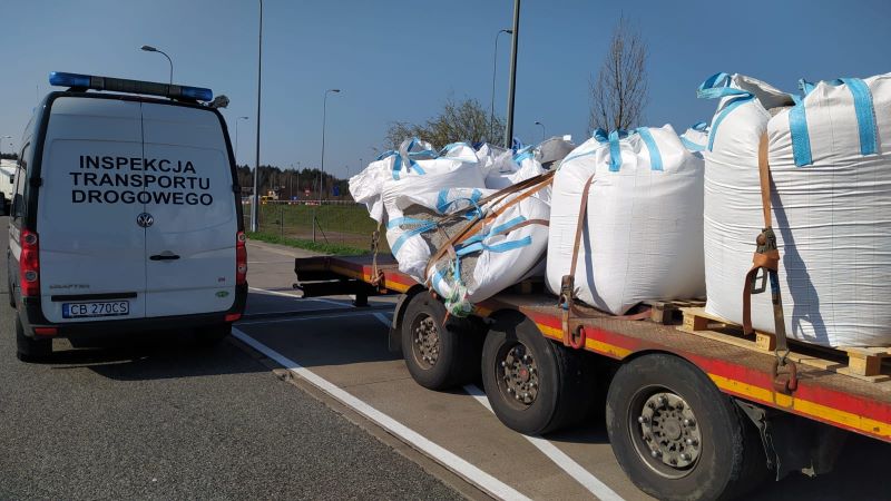 Kruszywo było zapakowane w workach typu big-bag umieszczonych na paletach. Uwagę inspektorów zwrócił fakt, iż jeden z worków był przewrócony i umieszczone w nim kruszywo wysypywało się na drogę. W trakcie kontroli stwierdzono, że 15 sztuk worków z kruszywem o masie 25 ton było zabezpieczone przed przemieszczaniem się jedynie za pomocą pasów spinających ładunek – po jednym pasie na dwa worki. Zabezpieczenie ładunku oraz zastosowany rodzaj naczepy były nieodpowiednie dla rodzaju przewożonego ładunku – worki nie były w ogóle zabezpieczone przed przesunięciem do przodu, co w przypadku gwałtownego hamowania mogłoby stworzyć duże zagrożenie dla bezpieczeństwa. Zabezpieczenie przed przemieszczeniem na boki za pomocą pasów okazało się również zupełnie nieskuteczne. Przeprowadzona kontrola stanu technicznego pojazdu wykazała kilka usterek, w tym jedną usterkę niebezpieczną. Na jednej z opon na osi napędowej ciągnika stwierdzono oderwane fragmenty bieżnika i uszkodzony metalowy kord opony. Usterka ta dyskwalifikowała pojazd z dalszego użytkowania na drogach publicznych.