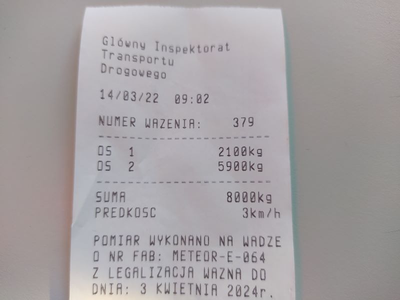 Wytypowane do kontroli pojazdy kierowane były na stanowiska wagowe, gdzie za pomocą wag dynamicznych weryfikowane były ich masy całkowite. Niestety, okazało się, że wszystkie pojazdy są znacznie przeładowane. Ciężarówki zamiast dopuszczalnych 3,5 t ważyły od 5,25 t do 8,0 t. Wszystkie pojazdy musiały zostać rozładowane do masy zgodnej z zapisami w ich dowodach rejestracyjnych. Ponadto kierowcy zostali ukarani mandatami karnymi w wysokości od 500 zł. Szofer rekordowo ciężkiego busa, który ważył 8 t, otrzymał mandat karny w najwyższej możliwej kwocie 3000 zł.