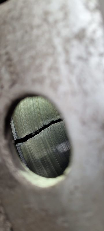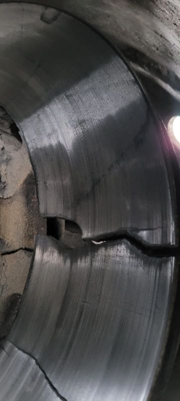 Kontrola układu hamulcowego wykazała, że tarcza hamulcowa zamontowana na jednym z kół trzeciej osi naczepy ma bardzo poważne pęknięcie. Była ona uszkodzona w tak znacznym stopniu, że brakowało jej fragmentu. Stan taki zagrażał bezpieczeństwu uczestników ruchu drogowego, gdyż tarcza ta mogła w każdej chwili rozpaść się i zablokować koło, a jej fragmenty uderzyć w jadące z tyłu pojazdy.