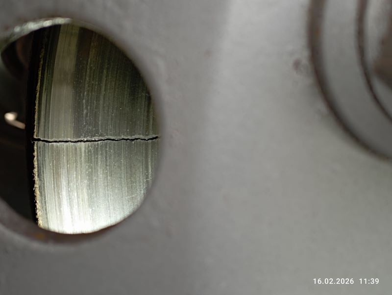 Podczas wstępnej, organoleptycznej kontroli stanu technicznego naczepy stwierdzono usterki zakwalifikowane jako niebezpieczne. Najpoważniejszą z nich była pęknięta tarcza hamulcowa prawego koła pierwszej osi – pęknięcie przebiegało przez całą grubość i szerokość tarczy, z wyraźnym przerwaniem ciągłości powierzchni ciernej. Tego rodzaju uszkodzenie bezpośrednio wpływa na skuteczność hamowania i stanowi realne zagrożenie w ruchu drogowym.