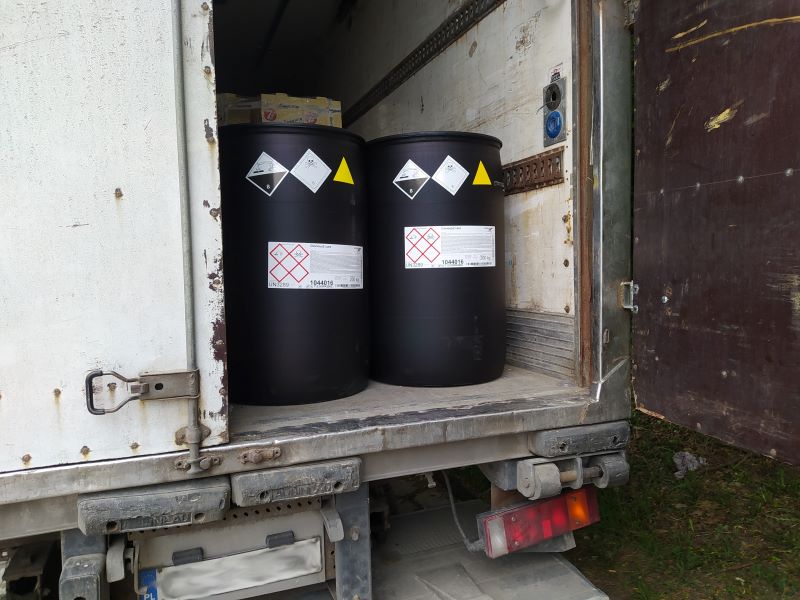Dwuosiową ciężarówką przewożone były różne przesyłki kurierskie z centrum logistycznego koło Włocławka do Mławy. Podejrzewając, że ciężarówka może być przeładowana inspektorzy skierowali ją na wagę. Rzeczywista masa pojazdu (19,85 t) większa o prawie dwie tony dopuszczalnej była dopiero początkiem nieprawidłowości. Chociaż pojazd nie posiadał żadnego oznakowania i elementów wyposażenia przeciwpożarowego i awaryjnego wymaganych przy przewozie towarów niebezpiecznych (ADR), to podczas oględzin ładowni okazało się, że znaczną część przewożonych ładunków stanowią właśnie tego typu towary klasy 3 (materiały ciekłe zapalne), kasy 8 (materiały żrące) i klasy 6.1 (materiały trujące).