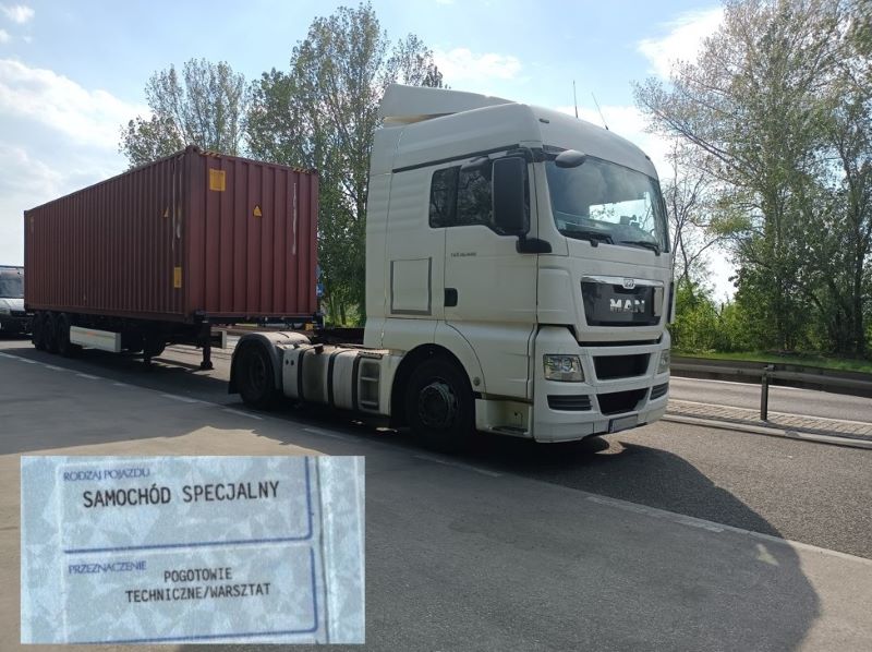 Uwagę kontrolującego inspektora wzbudziły zapisy w dowodzie rejestracyjnym ciągnika samochodowego świadczące o tym, że jest to… „POJAZD SPECJALNY” o przeznaczeniu „POGOTOWIE TECHNICZNE/WARSZTAT”. Tymczasem był to standardowy ciągnik siodłowy wykorzystywany przez przewoźnika drogowego w prowadzonej przez niego działalności gospodarczej w zakresie krajowego transportu drogowego i wykorzystywany do ciągnięcia naczep z ładunkami. Kontrola zakończyła się zatrzymaniem dowodu rejestracyjnego pojazdu z tytułu niezgodnych danych zawartych jego dowodzie rejestracyjnym oraz w systemie Centralna Ewidencja Pojazdów. Przewoźnik został tym samym zobligowany do poddania ciągnika badaniu technicznemu w Stacji Kontroli Pojazdów mającemu na celu przywrócenie jego prawidłowych danych w zakresie rodzaju i przeznaczenia pojazdu.