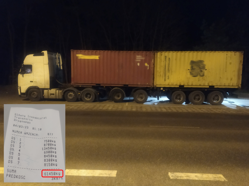 Zespół pojazdów składający się z ciągnika i dwóch łączonych ze sobą na sztywno przyczep został zatrzymany do kontroli w nocy z piątku na sobotę (3/4 marca) na autostradzie A1 przez inspektorów z włocławskiego oddziału kujawsko-pomorskiej Inspekcji Transportu Drogowego. Po zważeniu okazało się, że przewożone dwa 20-stopowe kontenery morskie z ładunkami drobnicowymi powodują przekroczenie dopuszczalnej masy całkowitej środka transportu ponad 20-ton. Zespół pojazdów ważył bowiem prawie 61,5 tony. Tak duża masa przewożonych towarów spowodowała także przekroczenia dopuszczalnych nacisków osi ciągnika i jednej z przyczep. Sama konfiguracja zespołu pojazdów też była nieprawidłowa. Ponadto, zgodnie z obowiązującymi przepisami, pojazd nienormatywny o masie przekraczającej 60 ton powinien być pilotowany, czego w tym przypadku również zabrakło. Inspektorzy ukarali mandatem karny kierowcę i nakazali jemu przywrócenie normatywności zespołu pojazdów, co wiązało się z koniecznością rozpięcia przyczep i przepięcia jej do innego ciągnika. Wobec przewoźnika toczy się postępowanie o nałożenie kary pieniężnej w drodze decyzji administracyjnej.