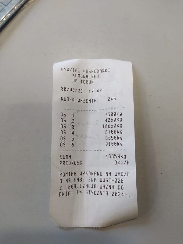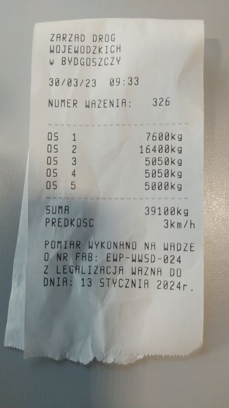 Ważenie dynamiczne na wagach samochodowych wykazało przekroczenie nacisku pojedynczej osi napędowej aż o 42 % - waga wskazała ponad 16 ton nacisku przy dopuszczalnych 11,5 ton. Przewoźnik podczas kontroli zadysponował ciągnik samochodowy wyposażony w podwójną osią napędową – co skutkowało prawidłowym rozłożeniem nacisków osi.