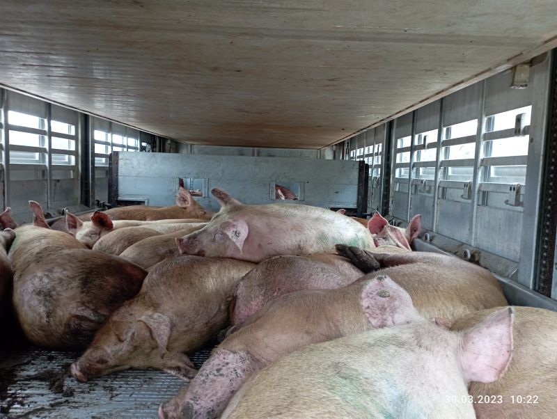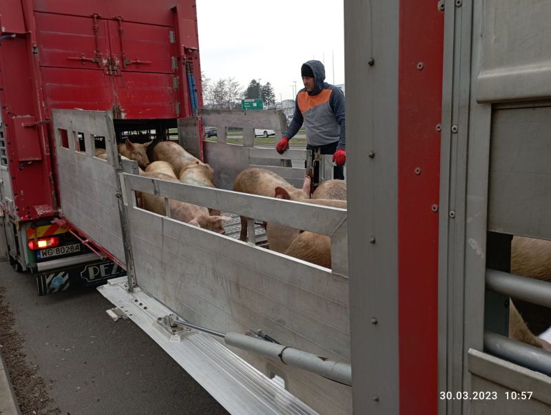 W pierwszym przypadku na autostradzie A1 został zatrzymany do kontroli specjalistyczny pojazd do przewozu żywych zwierząt, którym przewoźnik z województwa mazowieckiego wykonywał transport trzody chlewnej. Na samochodzie ciężarowym z przyczepą umieszczonych było 185 sztuk świń przeznaczonych do uboju. Kontrolujący inspektor zdecydował o skierowaniu pojazdu na punkt wagowy w związku z przypuszczeniem zbyt dużej masy całkowitej pojazdu z ładunkiem. Po zważeniu pojazdu okazało się, że jego rzeczywista masa całkowita wynosi 42900 kg, a więc przekracza dopuszczalną masę całkowitą o 2900 kg. W tej sytuacji koniecznym było przeładowanie około 30 sztuk świń do innego pojazdu podstawionego przez przewoźnika. Przeładunek odbywał się pod nadzorem przybyłego na miejsce kontroli Powiatowego Lekarza Weterynarii. Lekarz weterynarii nie stwierdził uchybień dobrostanu zwierząt, więc po przeładunku przewoźnik mógł kontynuować przewóz do miejsca docelowego.