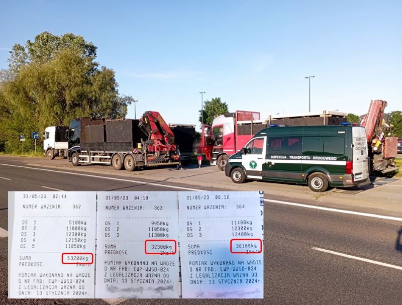 W nocy z wtorku na środę (30/31 maja) ten sam patrol Inspekcji Transportu Drogowego pełniący swoje obowiązki w okolicach Bydgoszczy wytypował do kontroli trzy pojazdy przewożące zbiorniki betonowe z pokrywami. Wszystkie pojazdy po skierowaniu na wagę okazały się przeładowane. Zespół pojazdów złożony z samochodu ciężarowego i przyczepy przewożący cztery elementy betonowe zamiast dopuszczalnych 40 ton ważył 53,2 tony. Z kolei dwie „solówki” przewożące po dwa szamba z pokrywami ważyły 32,3 t oraz 36,1 t. To znacznie więcej niż 26-tonowa norma ich masy całkowitej. We wszystkich przypadkach zostały przekroczone także dopuszczalne naciski osi na drogę – nawet o ponad 5 ton. Pojazdy o tak znacznie przekroczonych dopuszczalnych masach całkowitych i naciskach osi powodują przyspieszoną degradację dróg, których wszyscy jesteśmy użytkownikami.