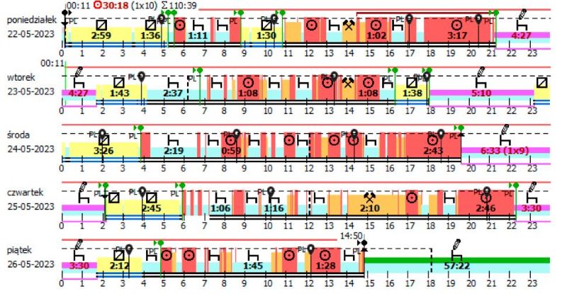 Ponadto jeden z kierowców wielokrotnie dopuścił się przekroczeń dopuszczalnych norm prowadzenia pojazdu i przez pięć dni nie odbierał prawidłowych odpoczynków. Kierowca, po zakończeniu odpoczynku niedzielę prowadził pojazd do piątkowego popołudnia, wykorzystując w tym czasie przerwy trwające od 3,5 do 4,5 godziny. To znacznie mniej niż minimalna 9-godzinna norma odpoczynku po całym dniu jazdy.