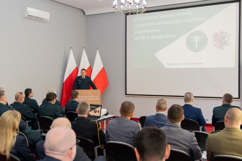 Dzisiejsza uroczystość była też okazją do podziękowania inspektorom Inspekcji Transportu Drogowego za ich codzienną pracę na rzecz poprawy bezpieczeństwa w ruchu drogowym oraz zachowania zasad uczciwej konkurencji w przewozach drogowych ładunków i osób. Czternastu inspektorów w dniu dzisiejszym otrzymało z rąk p.o. Zastępcy Głównego Inspektora Transportu Drogowego oraz Kujawsko-Pomorskiego Wojewódzkiego Inspektora Transportu Drogowego awanse na wyższe stanowiska służbowe. Wszystkim awansowanym gratulujemy i życzymy dalszych sukcesów.