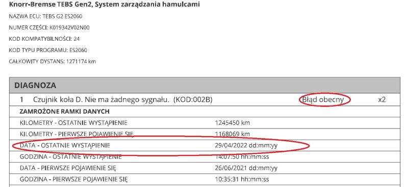Dodatkowo wykonano diagnostykę komputerową układu ABS naczepy, w wyniku której ustalono, iż uszkodzeniu uległ jeden z czujników prędkości układu ABS. Zgodnie z odczytem danych diagnostycznych za pomocą komputera, stwierdzono, iż ww. naczepa z niesprawnym czujnikiem ABS poruszała się po drogach od kwietnia br.