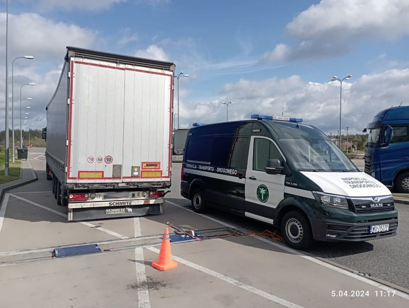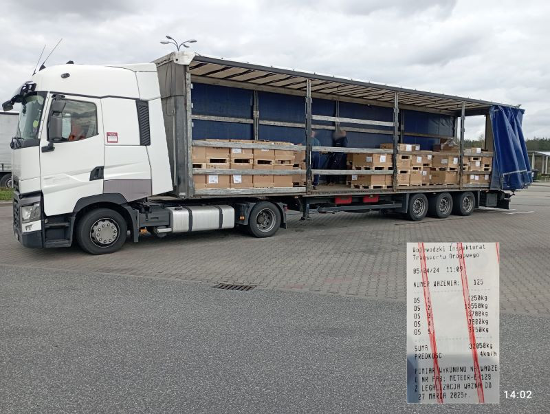 Oględziny ładowni naczepy nasunęły pytania kontrolujących. W związku z uzasadnionym przypuszczeniem przekroczenia dopuszczalnych parametrów kontrolowanego środka transportu z ładunkiem wykonano pomiary jego wymiarów zewnętrznych, nacisków osi oraz rzeczywistej masy całkowitej. W wyniku przeprowadzonego ważenia stwierdzono złe rozmieszczenie ładunku, co w konsekwencji skutkowało przekroczeniem dopuszczalnego nacisku pojedynczej osi napędowej o ponad 2 tony.