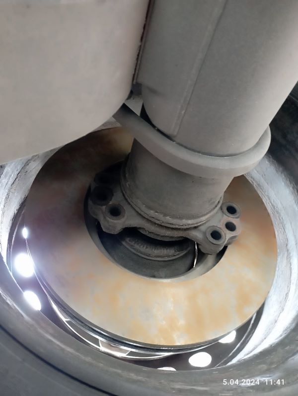 Podczas oględzin pojazdu stwierdzono brak zacisku hamulcowego, brak siłownika uruchamiającego hamulec oraz odłączony przewód pneumatyczny doprowadzający powietrze do siłownika.