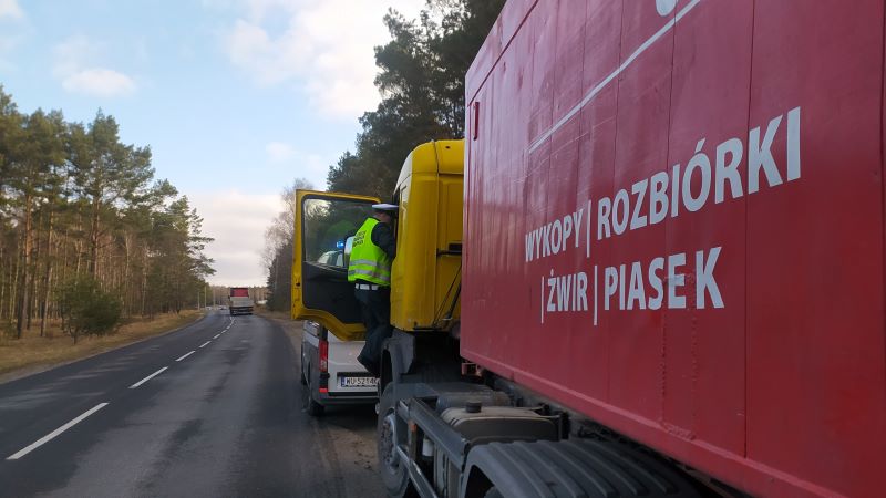 W dniu 5 kwietnia br. bydgoscy inspektorzy odpowiadając na skargi mieszkańców dotyczące ruchu pojazdów ciężarowych pomimo obowiązującego zakazu dla ciężarówek dłuższych niż 12 metrów w miejscowości Przyłęki, zatrzymali do kontroli m.in. pojazd członowy, którym wykonywano przewóz piasku.