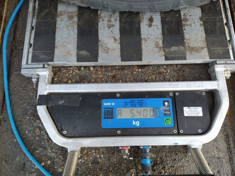W związku z uzasadnionym przypuszczeniem przekroczenia dopuszczalnych parametrów kontrolowanego środka transportu z ładunkiem, wykonano pomiary jego wymiarów zewnętrznych, nacisków osi oraz rzeczywistej masy całkowitej.