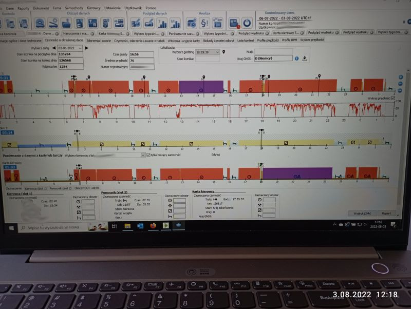 Na podstawie analizy danych zapisanych w pamięci tachografu, kontrolujący inspektor stwierdził, iż kierowca godzinę przed kontrolą rejestrował swoje dane na karcie innego kierowcy. Kierowca okazał cudzą kartę kierowcy, którą schował w pojemniku znajdującym się w jednym ze schowków naczepy. Analiza danych zapisanych w pamięci tachografu oraz na karcie kierowcy wykazała liczne naruszenia z zakresu czasu pracy m.in. w ostatnich trzech dniach najdłuższy odpoczynek kierowcy wyniósł tylko 2 godziny i 55 minut, natomiast łączny czas jazdy dziennej, aż ponad 24 godziny.