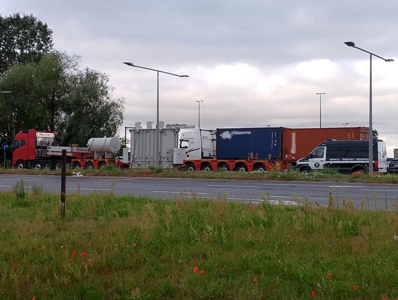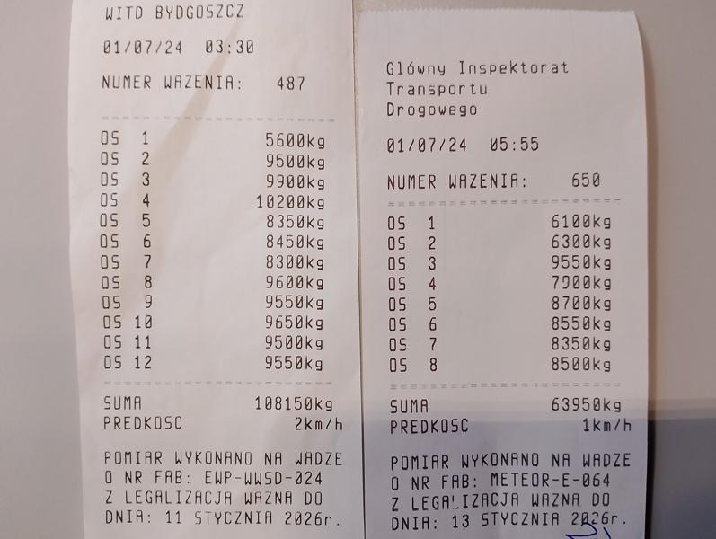 Około godz. 2:00 inspektorzy postanowili sprawdzić 12-osiowy zestaw przewożący transformator. Po skierowaniu na wagę w Bydgoszczy okazało się, że pojazd członowy waży ponad 108 ton. Niestety, zezwolenie kategorii V na przejazd pojazdu nienormatywnego okazane przez kierowcę okazało się niewystarczające, bowiem faktyczne naciski osi ciągnika przekraczały wartości wskazane w tym dokumencie. Ponadto przejazd tak ciężkiego pojazdu nienormatywnego (o masie całkowitej powyżej 80 ton) powinien być zabezpieczany przy użyciu dwóch pojazdów pilotujących. W tym przypadku przewoźnik zadysponował tylko jeden taki pojazd, który dodatkowo nie posiadał wymaganych przepisami elementów oznakowania i wyposażenia.