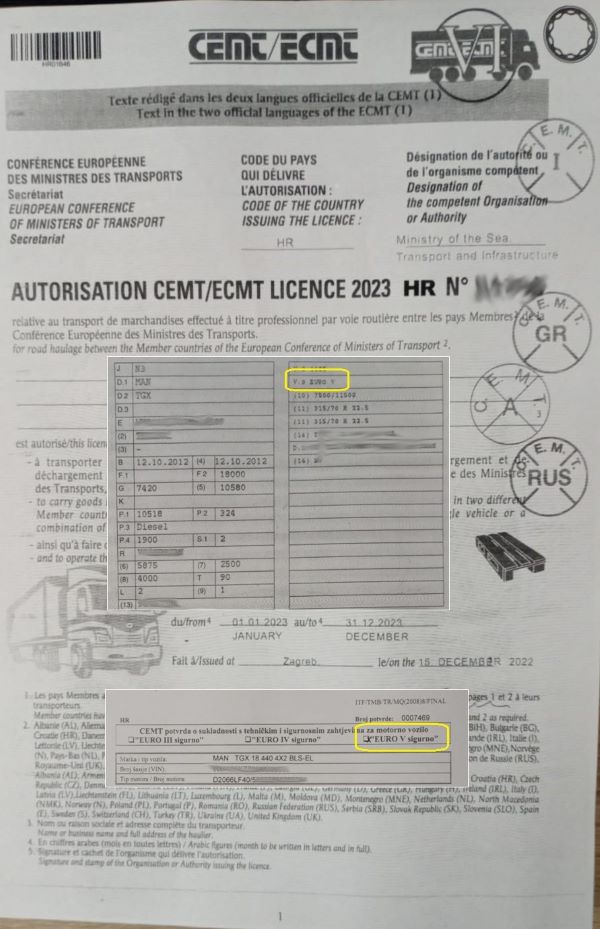 W tym przypadku kierowca przedstawił zezwolenie EKMT, które wymagało użycia pojazdu o normie emisji spalin co najmniej EURO VI. Na podstawie przedstawionego certyfikatu oraz dowodu rejestracyjnego kontrolujący inspektor stwierdził, iż ciągnik samochodowy, którym był wykonywany transport spełniał normę EURO V, a więc nie mógł być wykorzystany do realizacji tego przewozu z użyciem przedstawionego zezwolenia. Ponadto podczas kontroli stanu technicznego naczepy ciężarowej stwierdzono liczne pęknięcia elementów konstrukcyjnych, podtrzymujących m.in. podłogę naczepy. Skutkiem powyższych nieprawidłowości było uznanie okazanego zezwolenia EKMT jako nieważne.