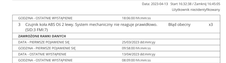 Już wstępna kontrola wykazała jednak nieprawidłowości w tym zakresie. Z informacji wyświetlanych na desce rozdzielczej pojazdu wynikało, że samochód ciężarowy ma niesprawny układ ABS, a w przypadku przyczepy taki układ w ogóle nie występuje. W dalszej części kontroli inspektorzy wykorzystując tester diagnostyczny, ustalili, iż przyczyną niesprawności układu ABS w samochodzie jest uszkodzony czujnik prędkości obrotowej koła lewego na drugiej osi pojazdu. W przypadku przyczepy przyczyną braku układu ABS był uszkodzony przewód łączący samochód z przyczepą, co skutkowało całkowitym brakiem zasilania w układzie ABS.