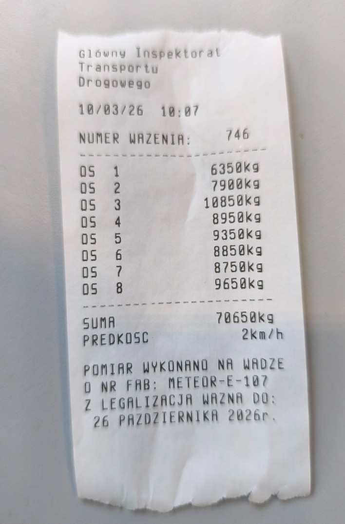 W trakcie powyższych działań zidentyfikowano 6 pojazdów nienormatywnych, których rzeczywista masa całkowita znacznie przekraczała dopuszczalne limity. Najpoważniejsze naruszenie dotyczyło zespołu pojazdów przewożącego kontenery, którego masa przekroczyła 70 ton, czyli była większa od dopuszczalnej o ponad 30 ton.
