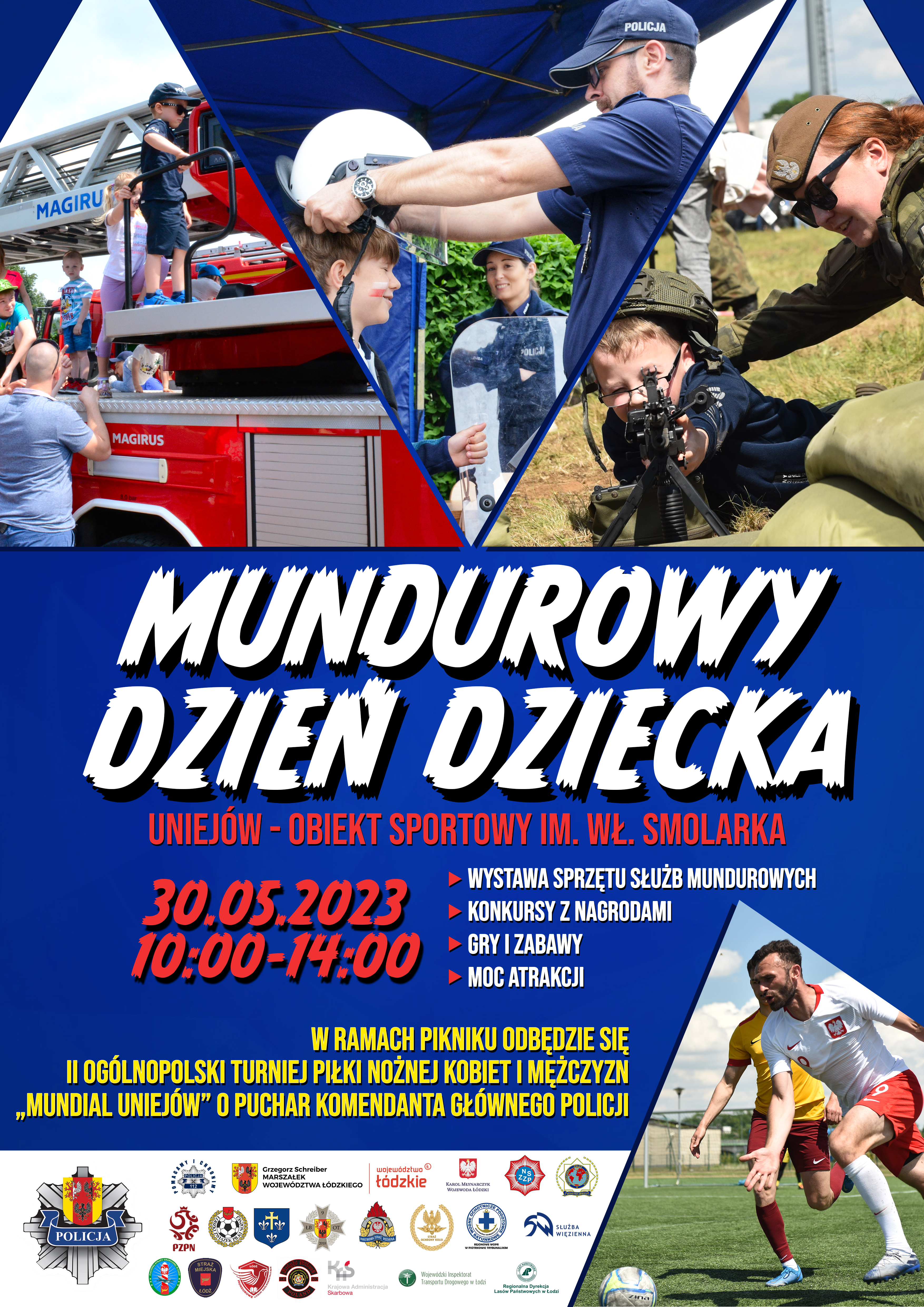 Łódzki Wojewódzki Inspektor Transportu Drogowego zaprasza na organizowany przez Komendanta Wojewódzkiego Policji Mundurowy Dzień Dziecka. Impreza odbędzie się 30 maja 2023 r. w godzinach 10:00 – 14:00 w Uniejowie na terenie Kompleksu Boisk im. Włodzimierza Smolarka. W jej ramach zaplanowano między innymi wystawę sprzętu służb mundurowych, liczne konkursy i zabawy z nagrodami, a także turniej piłki nożnej kobiet i mężczyzn o Puchar Komendanta Głównego Policji.
