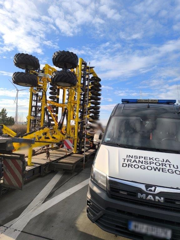 W dniu 29.01.2025 r. inspektorzy z piotrkowskiego oddziału WITD w Łodzi, na drodze ekspresowej S8, zatrzymali do kontroli zespół pojazdów należący do ukraińskiego przewoźnika, który realizował międzynarodowy transport drogowy rzeczy na trasie Czechy – Ukraina. W tym przypadku przewożono agregat rolniczy czyli ładunek niepodzielny. Przeprowadzone czynności wykazały, że wysokość kontrolowanego zespołu wynosi 4,42 m, a tym samym przekracza wartość normatywną o 10,5 %. Przewoźnik nie posiadał stosownego zezwolenia umożliwiającego przejazd pojazdu nienormatywnego po drogach publicznych.