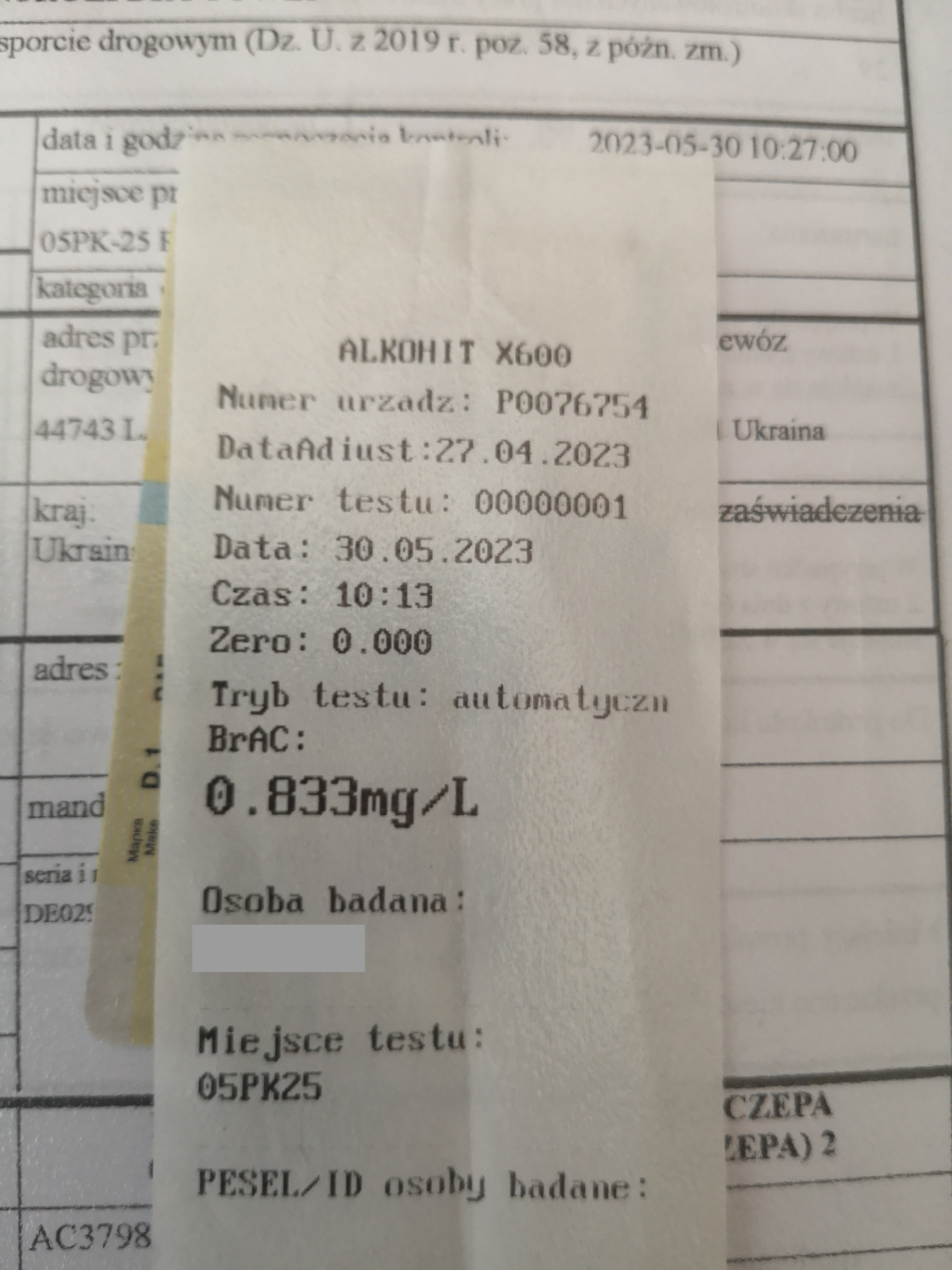 30 maja 2023 r. inspektorzy z oddziału piotrkowskiego prowadzili działania kontrolne na drogach powiatu opoczyńskiego. W ich czasie zatrzymano dwa zespoły pojazdów należące do przewoźnika ukraińskiego. W czasie rozmowy od obu kierowców inspektorzy wyczuli silną woń alkoholu. Przeprowadzone badania zawartości alkoholu w wydychanym powietrzu potwierdziły niestety te obserwacje. U pierwszego z kierowców stwierdzono 0.26 mg/l, u drugiego zwartość alkoholu była zdecydowanie większa bo sięgała aż 0,83 mg/l.