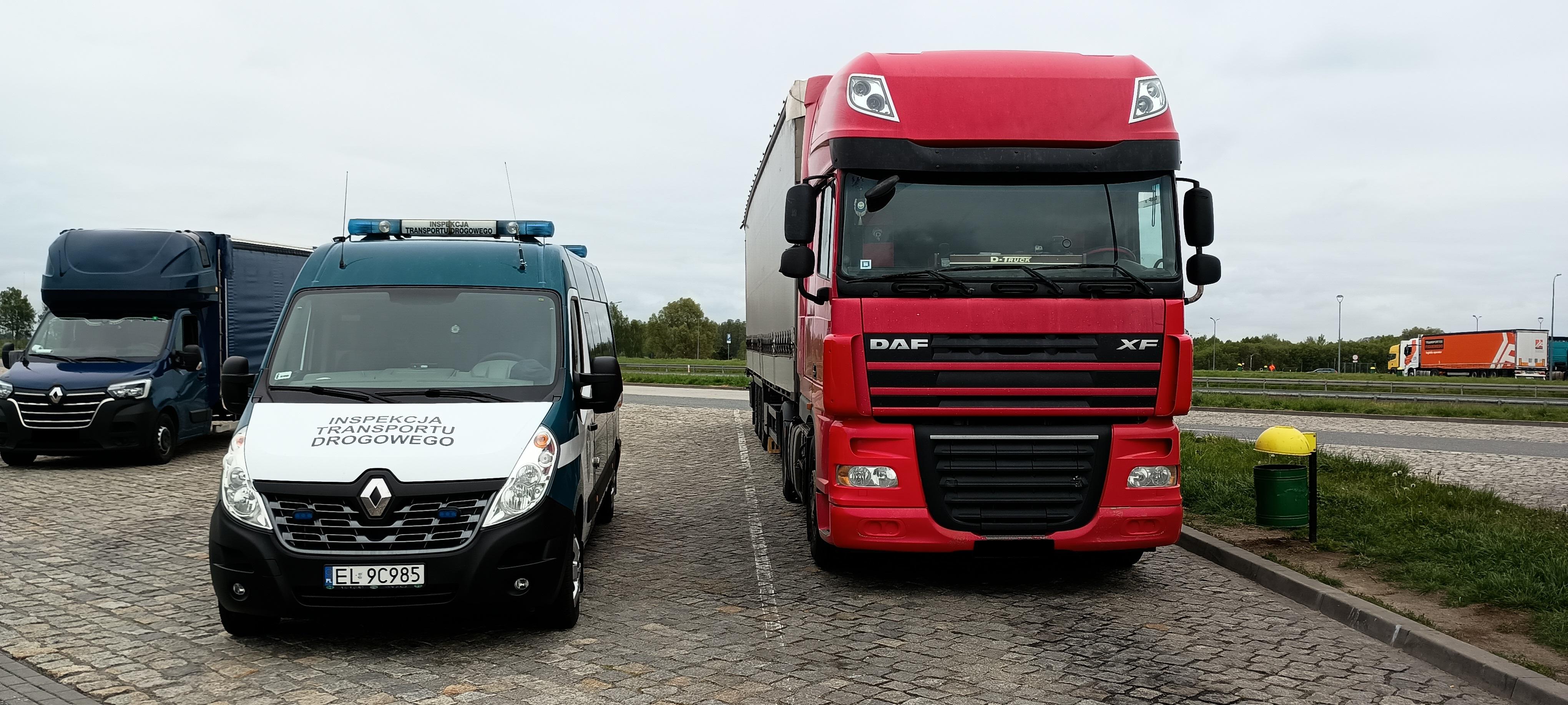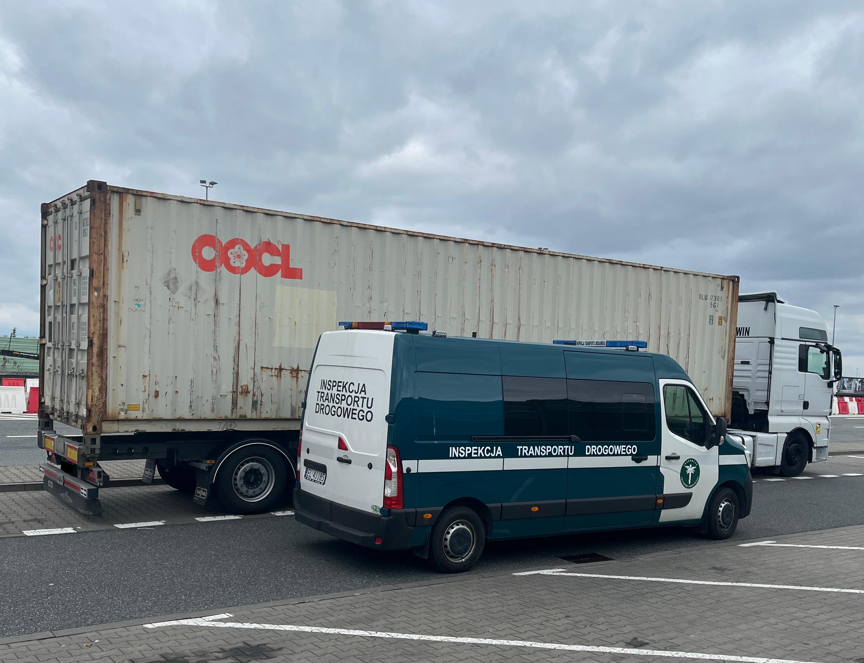 W tym samym czasie zainteresowanie inspektorów pracujących w okolicach Strykowa wzbudził pojazd przewoźnika z Rumunii, którym przewożono kontener. Umieszczone na nim oznakowanie wskazywało, że w jego wnętrzu znajdują się towary niebezpieczne, ale pojazd nie był wyposażony w wymagane w takich wypadkach tablice. Jak się wkrótce potem okazało kierowca nie ma żadnego dokumentu na podstawie którego można by stwierdzić jaki towar jest obiektem przewozu. Oględziny wnętrza kontenera i przewożonego towaru też nie pozwoliły na uzyskanie odpowiedzi na to podstawowe pytanie, a kierowca nie był też w stanie nic wyjaśnić. Być może przyczyną tego stanu rzeczy było to, że nie odbył wymaganych szkoleń i nie uzyskał uprawnień niezbędnych do przewozu towarów niebezpiecznych. Wszystko to spowodowało, że inspektorzy skierowali pojazd na parking strzeżony do czasu uzupełnienia wymaganej dokumentacji, oznakowania, wyposażenia awaryjnego i zapewnienia kierowcy, który będzie mógł kontynuować podróż.