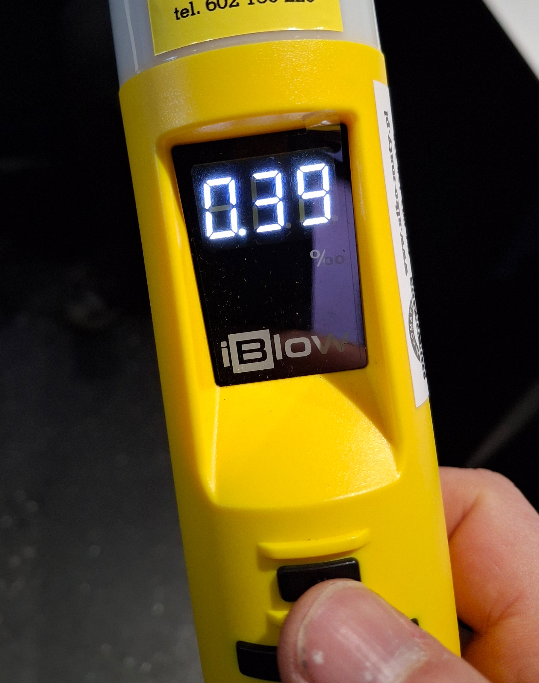 Podczas pobierania wymaganych dokumentów, inspektorzy wyczuli woń alkoholu od kierującego. Inspektorzy niezwłocznie przebadali kierowcę za pomocą alkosensora, na obecność alkoholu w wydychanym powietrzu tym samym potwierdzając swoje podejrzenia, wynik to 0,39 promila alkoholu w wydychanym powietrzu.