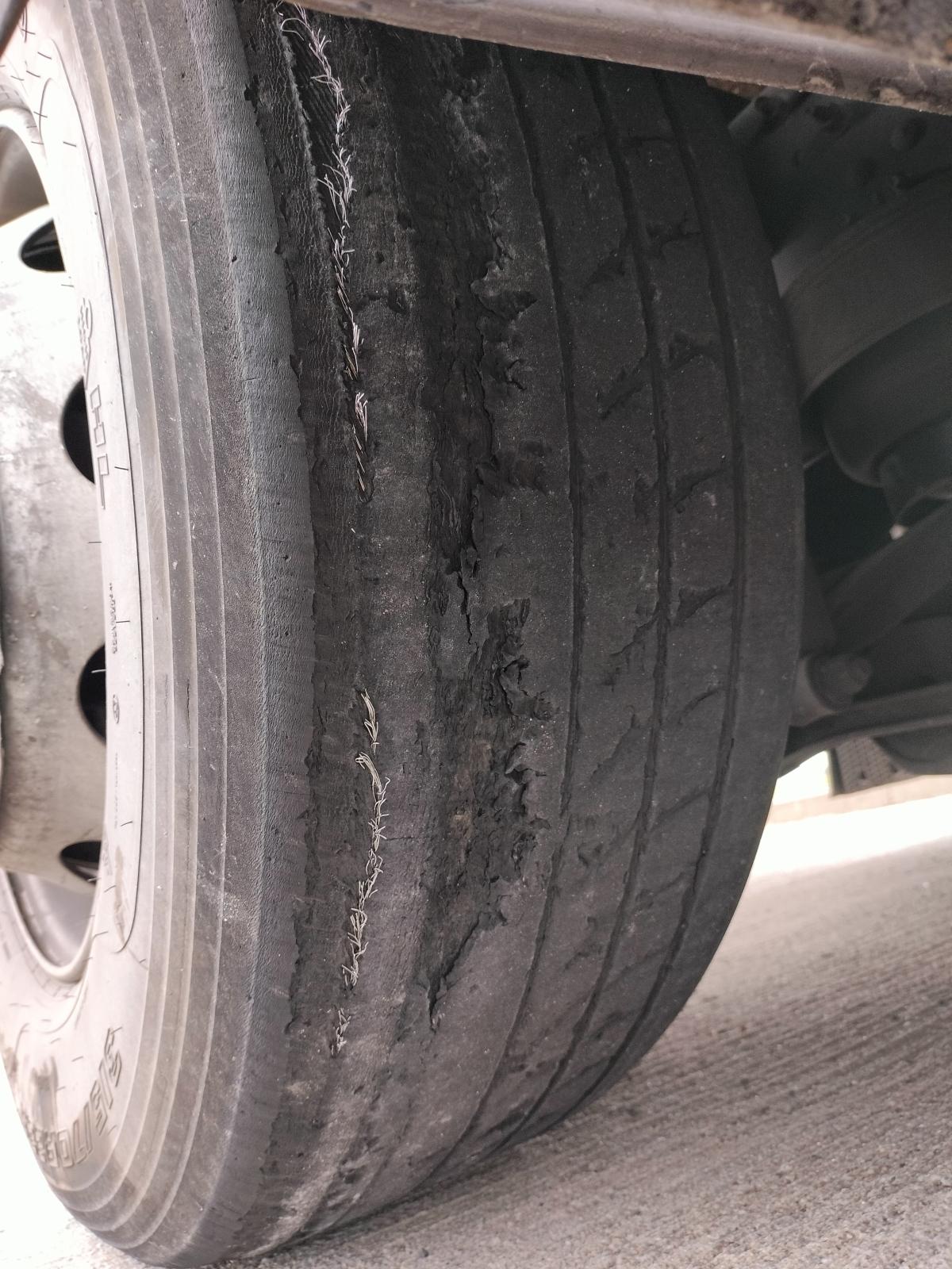 W trakcie kontroli samochodu ciężarowego inspektorzy stwierdzili liczne naruszenia z zakresu stanu technicznego, ujawniając usterki drobne, poważne i niebezpieczne, między innymi nadmiernie zużyty i uszkodzony, z widocznym kordem bieżnik opon, na osi trzeciej. Ponadto jedna z opon ocierała o fartuchy przeciwbłotne, a światła pozycyjne z prawej strony były niesprawne. Ewidentnie było widać uszkodzoną dość mocno prawą stronę samochodu. Został zatrzymany dowód rejestracyjny a kierowcy zakazano dalszej jazdy, do czasu wykonania naprawy pojazdu przez wyspecjalizowany serwis. Inspektorzy ujawnili także 8 naruszeń z czasu pracy, między innymi dwukrotne, bardzo duże skrócenie odpoczynku dziennego o 05h51' oraz o 04h39'. Kierowca został ukarany pięcioma mandatami karnymi, łącznie na kwotę 1 650 zł. Wobec przedsiębiorcy zostanie wszczęte postępowanie administracyjne, zagrożone karą 7 150 zł, a wobec osoby zarządzającej transportem na kwotę 1 000 zł.