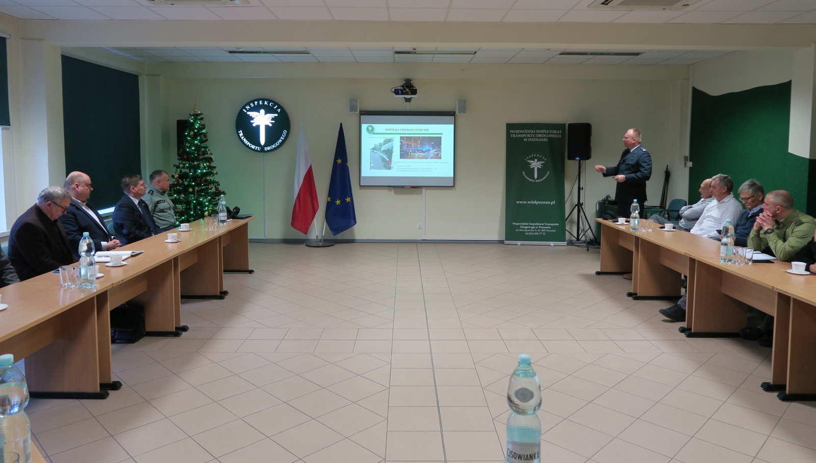 Dyrektor Tomasz Tański przedstawił realizację Ramowego Planu Kontroli WITD w Poznaniu, za okres styczeń-listopad 2024. Mówił o walce z nieuczciwą konkurencją, o kontrolach drogowych przewozu osób, przewozu odpadów wraz z Inspektorami z Wojewódzkiego Inspektoratu Ochrony Środowiska, kontrolach przewozu zwierząt oraz wspólnych akcjach z innymi służbami, dotyczących przewozu osób taxi. W drugim wystąpieniu Naczelnik Wydziału Prawnego Łukasz Bilski omówił zebranym zmiany w przepisach prawa, w II połowie 2024 roku. Uczestnicy spotkania dyskutowali na temat aktualnych kwestii, związanych z problematyką transportu drogowego. Na koniec spotkania Dyrektor WITD w Poznaniu złożył wszystkim uczestnikom życzenia spokojnych i pełnych ciepła Świąt Bożego Narodzenia oraz sukcesów w 2025 roku.