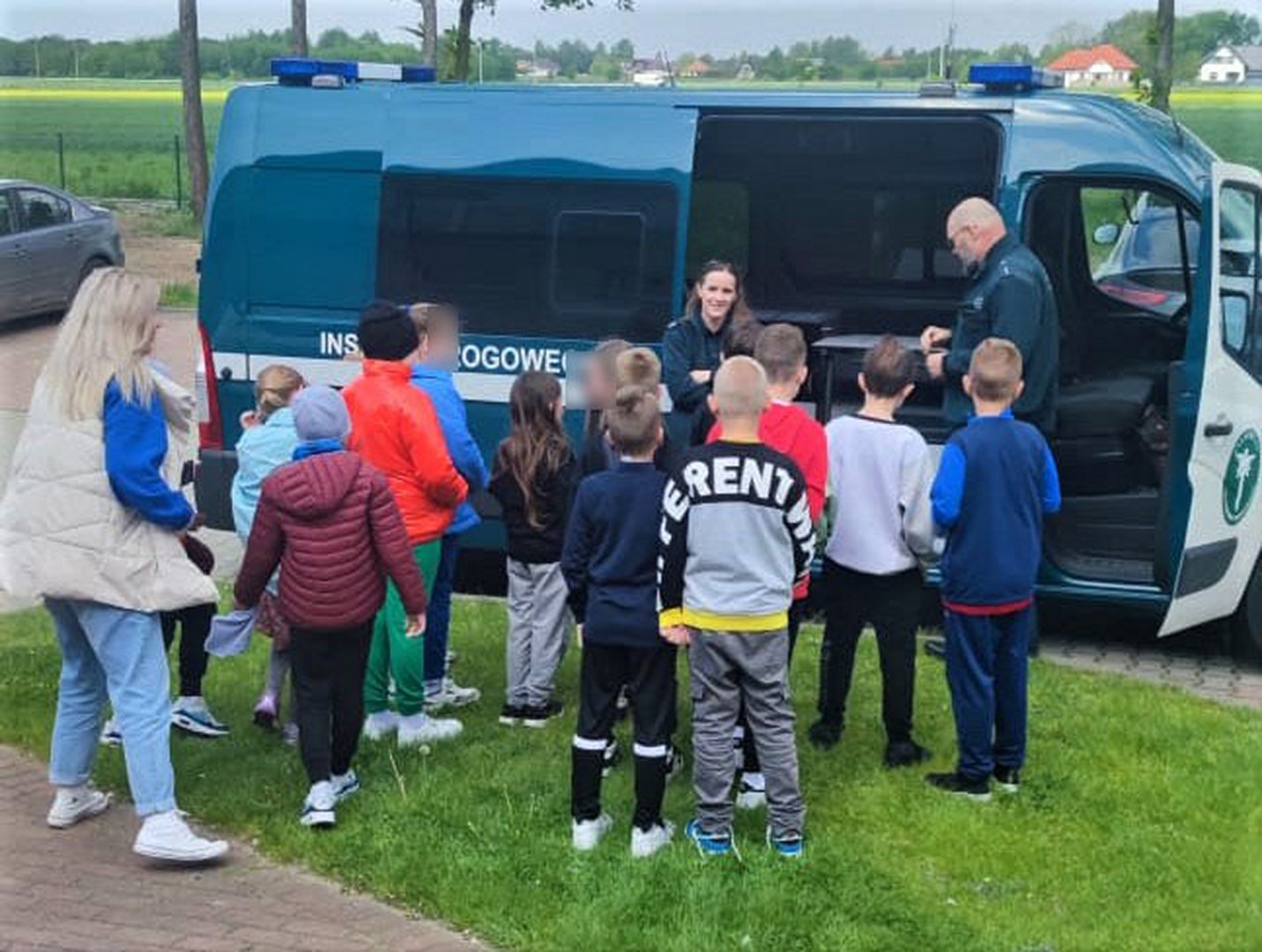 Uczniowie z klas siódmych podstawówki zapoznali się z charakterem pracy inspektora transportu drogowego, a ci młodsi mogli obejrzeć wóz patrolowy inspekcji.