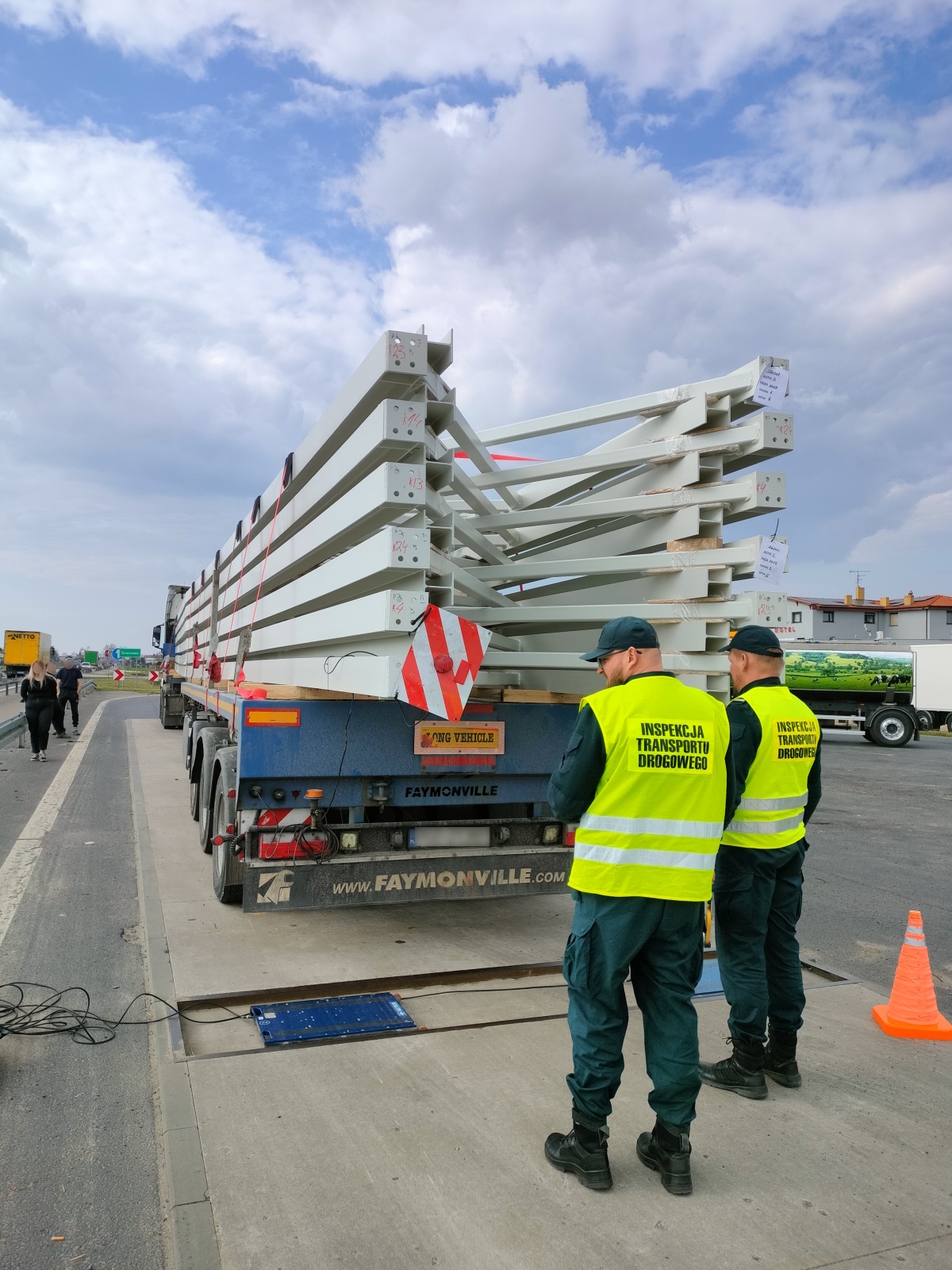 Do kontroli zatrzymano kolumnę dwóch pojazdów przewożących konstrukcje metalowe. Pomiary wykazały, że długość każdego z nich przekracza 27 metrów. Przewoźnik okazał tylko jedno zezwolenie kategorii IV, a kolumna pilotowana była przez jednego pilota. Zgodnie z przepisami każdy pojazd nienormatywny wymaga oddzielnego zezwolenia, a kolumna pojazdów nienormatywnych powinna być pilotowana przez dwa pojazdy.