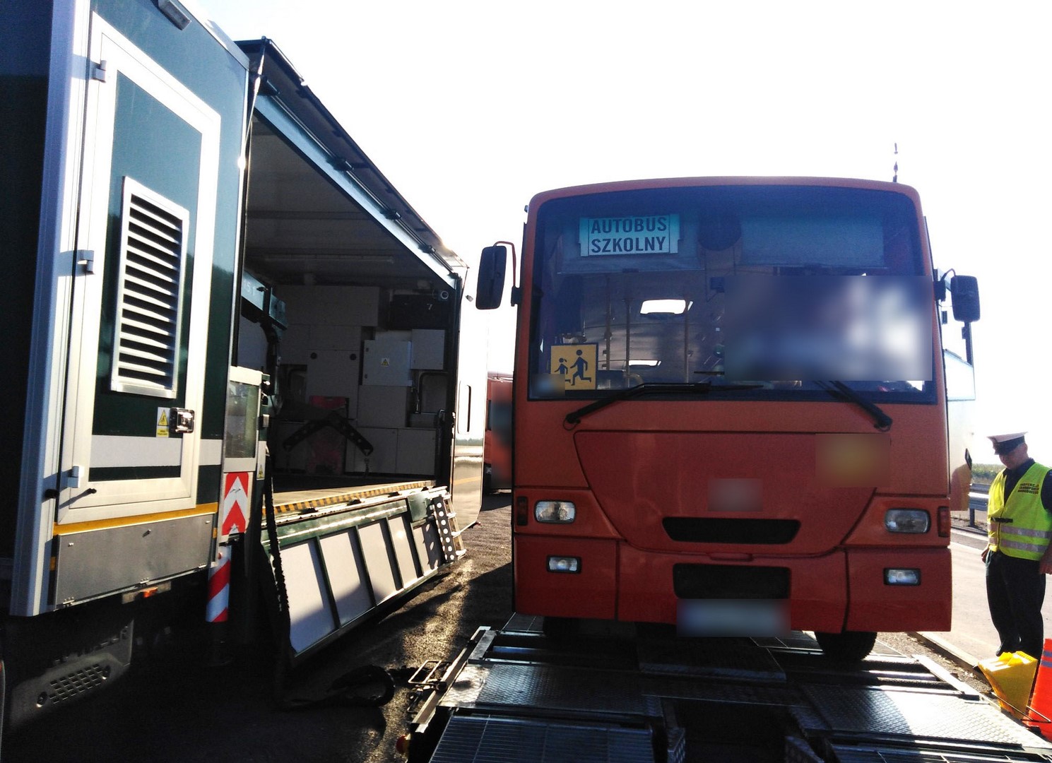 Kontrola gimbusa dowożącego dzieci do szkoły odbyła się przy użyciu mobilnej jednostki diagnostycznej, która wykazała usterki pojazdu.