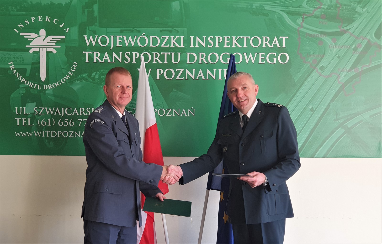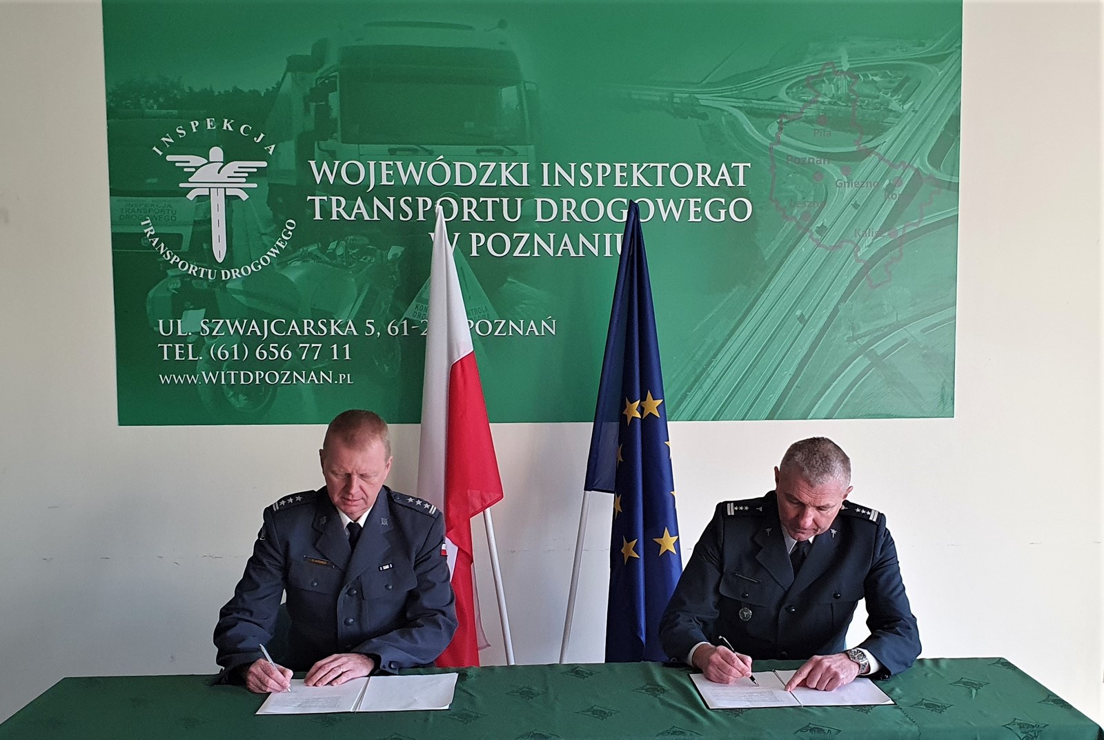 Podpisanie Porozumienia o współpracy między Wojewódzkim Inspektoratem Transportu Drogowego w Poznaniu i Okręgowym Inspektoratem Służby Więziennej w Poznaniu odbyło się 28 lutego w siedzibie WITD przy ul. Szwajcarskiej 5. Sygnowali je Dyrektor Okręgowej Służby Więziennej w Poznaniu płk Cezary Kosacz i Wielkopolski Wojewódzki Inspektor Transportu Drogowego w Poznaniu Aleksander Żołędziowski. Celem współpracy w ramach Porozumienia jest stworzenie zasad komplementarnych działań na rzecz wspierania wzajemnych inicjatyw oraz wymiany doświadczeń i wiedzy, w tym popularyzowania i promowania swojej działalności. Sygnatariusze Porozumienia zobowiązali się w nim między innymi do: wzajemnego wsparcia i uczestnictwa w ramach organizowanych kampanii edukacyjnych, społecznych i prewencyjnych; organizowania wspólnych warsztatów oraz szkoleń specjalistycznych i wymiany doświadczeń.