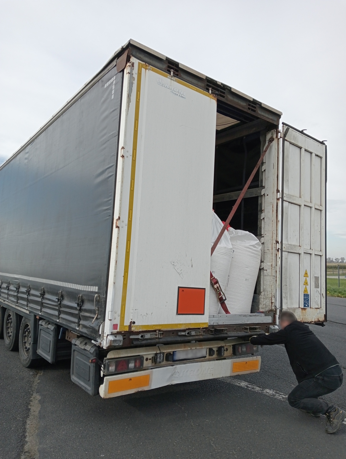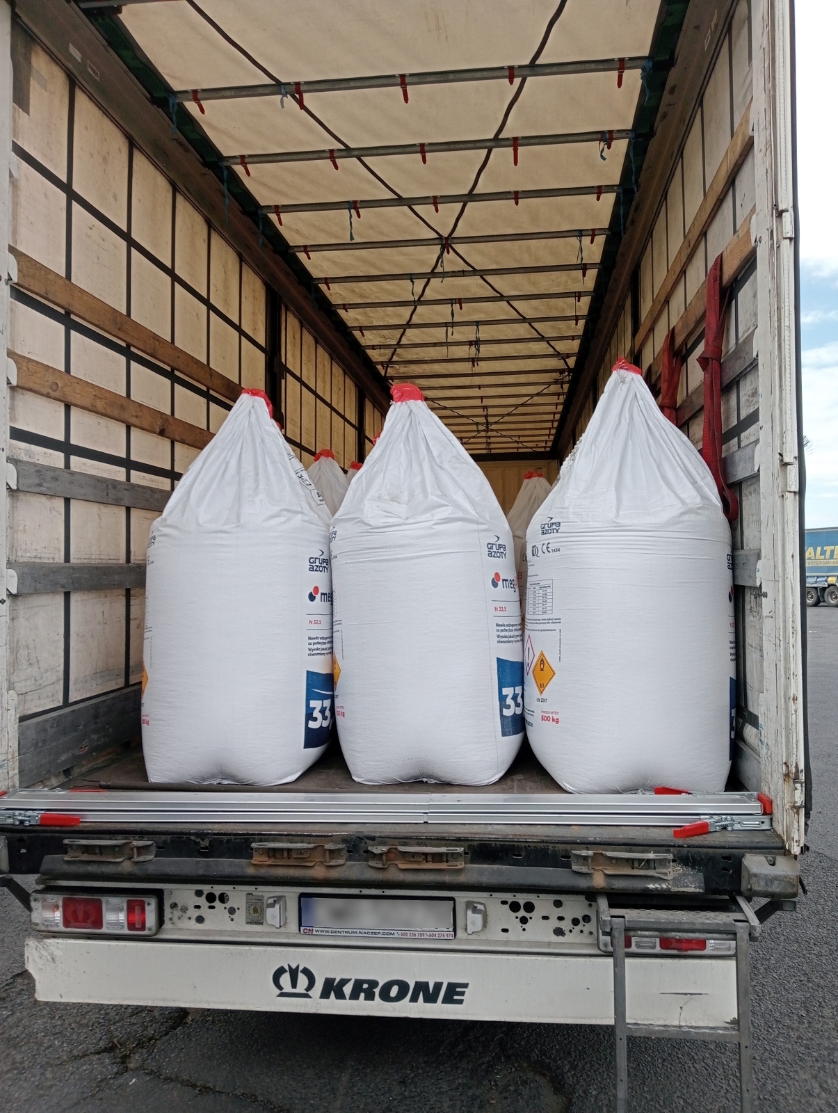 Podczas kontroli przestrzeni ładunkowej ujawniono, iż w obydwu przypadkach przewożony jest ładunek niebezpieczny, określony pod UN 2067 nawóz na bazie azotanu amonu 5.1, III (E), w ilości 24 ton, zapakowany w worki typu BIG BAG, po 500 kg. Powyższy ładunek nie był spięty pasami mocującymi ani zabezpieczony w jakikolwiek inny sposób, co w jednym przypadku spowodowało przemieszczenie sią ładunku na prawą stronę.
