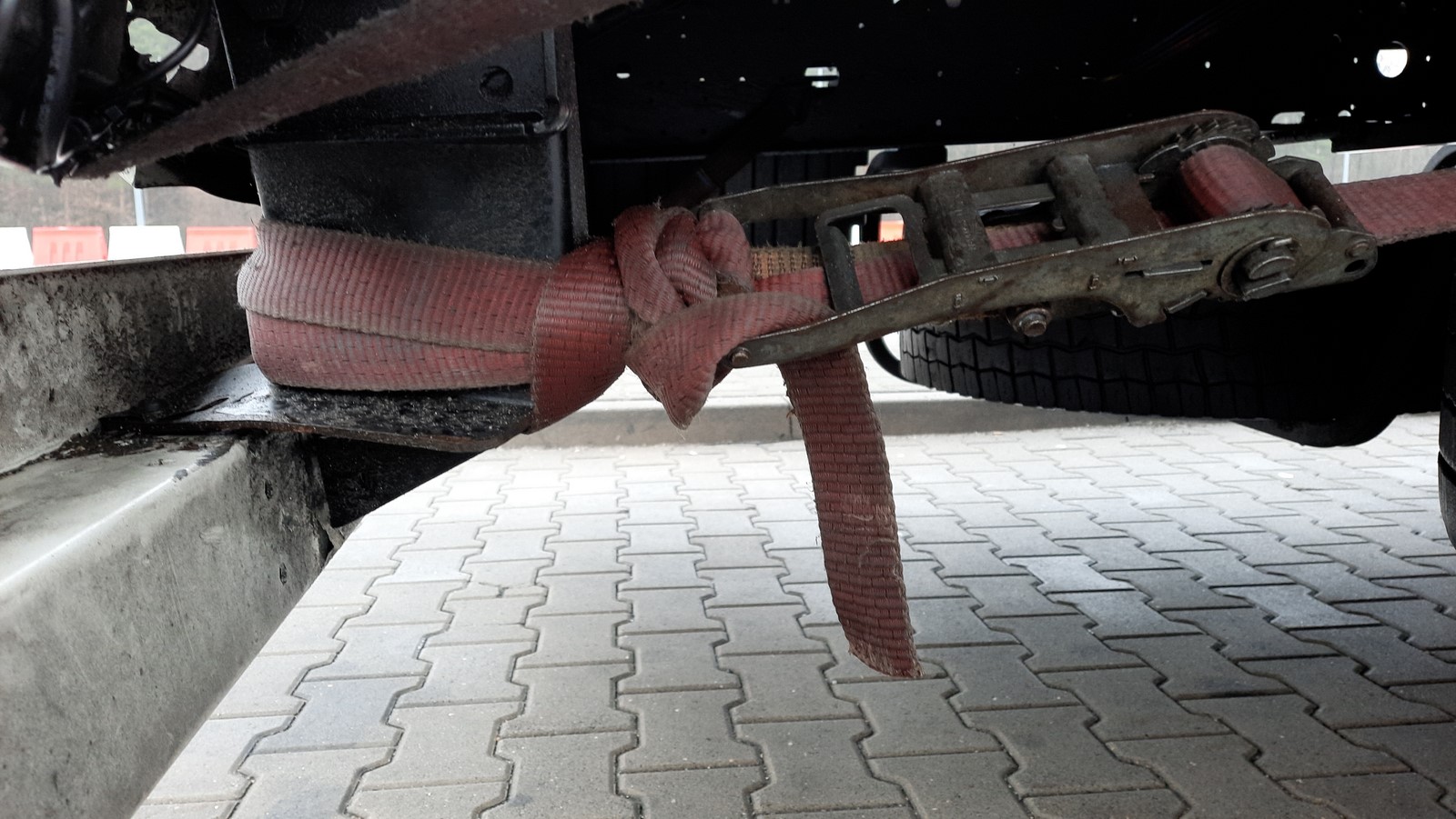Uszkodzony zderzak naczepy wyrwał się z elementu konstrukcyjnego ramy i został prowizorycznie przymocowany pasami przez kierowcę. Szofera zatrzymali inspektorzy z Konina i ukarali mandatem.