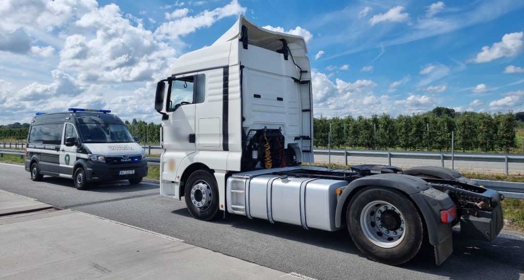 Kierował ciągnikiem siodłowym na „ekspresówce”, choć nie miał wymaganych do tego uprawnień. Mężczyzna miał tylko prawo jazdy kategorii B. Swoje aktywności rejestrował na konto innej osoby, ponieważ nie mógł wyrobić własnej karty do tachografu.