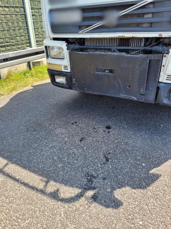 W trakcie kontroli stanu technicznego, inspektorzy stwierdzili znaczne wycieki oleju z silnika i skrzyni biegów ciężarówki. W miejscu postoju powstały spore plamy oleju na nawierzchni punktu kontrolnego. Wykryta usterka zagrażała bezpieczeństwu w ruchu drogowym i środowisku naturalnemu.