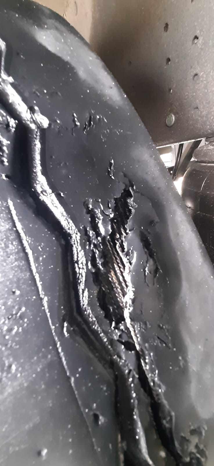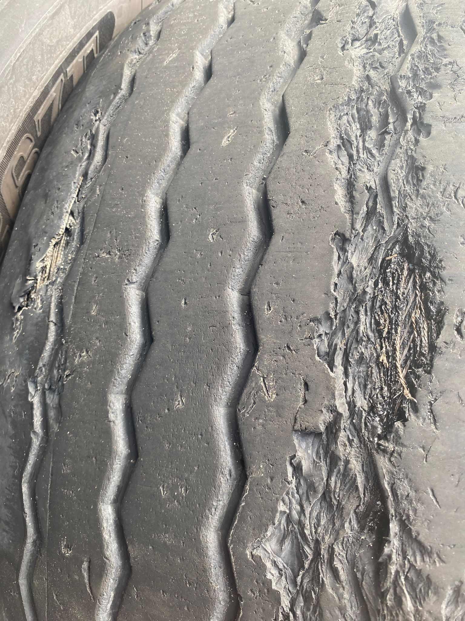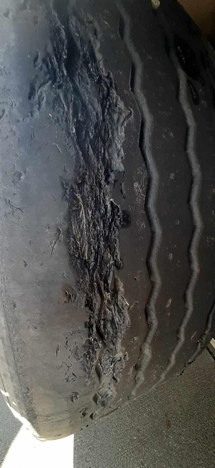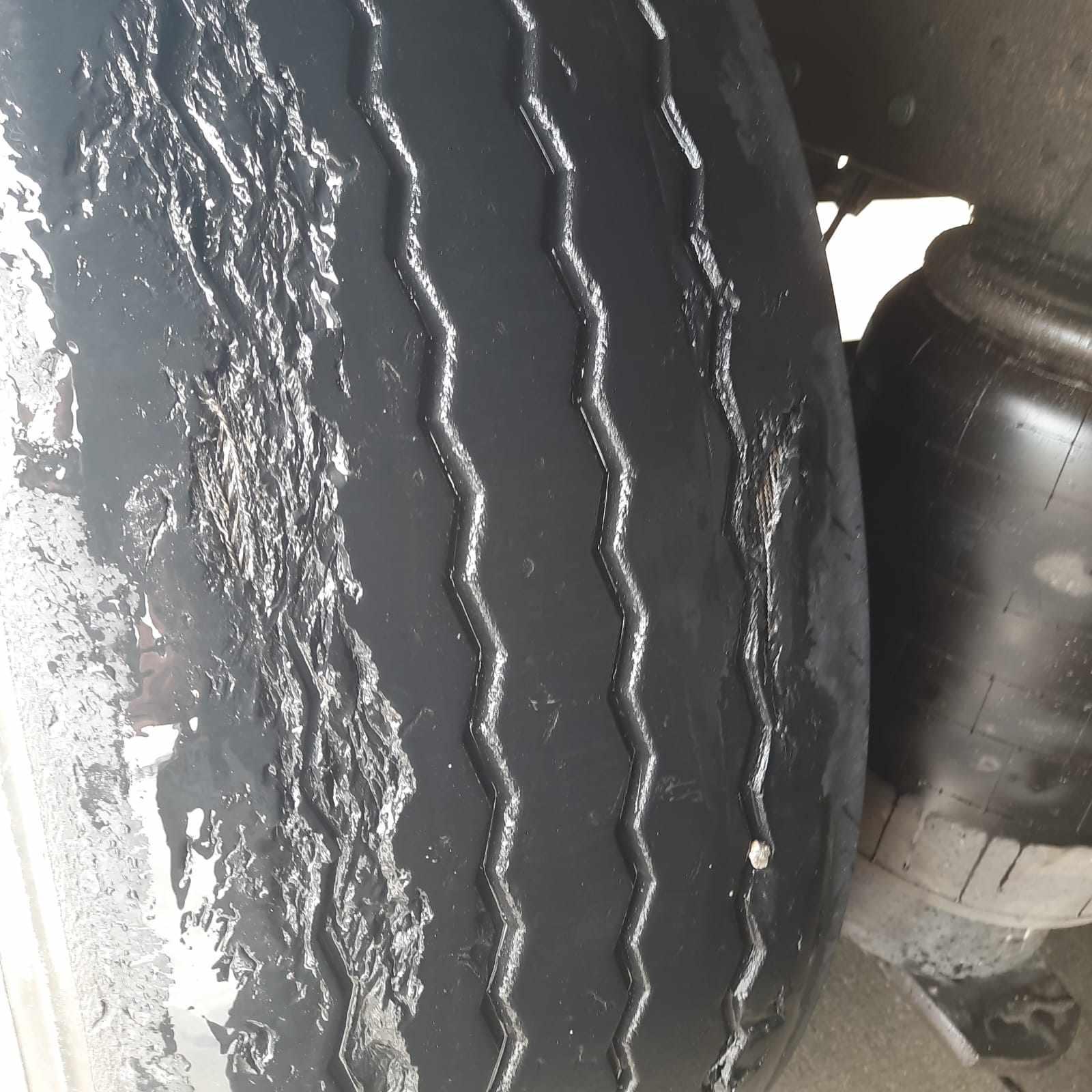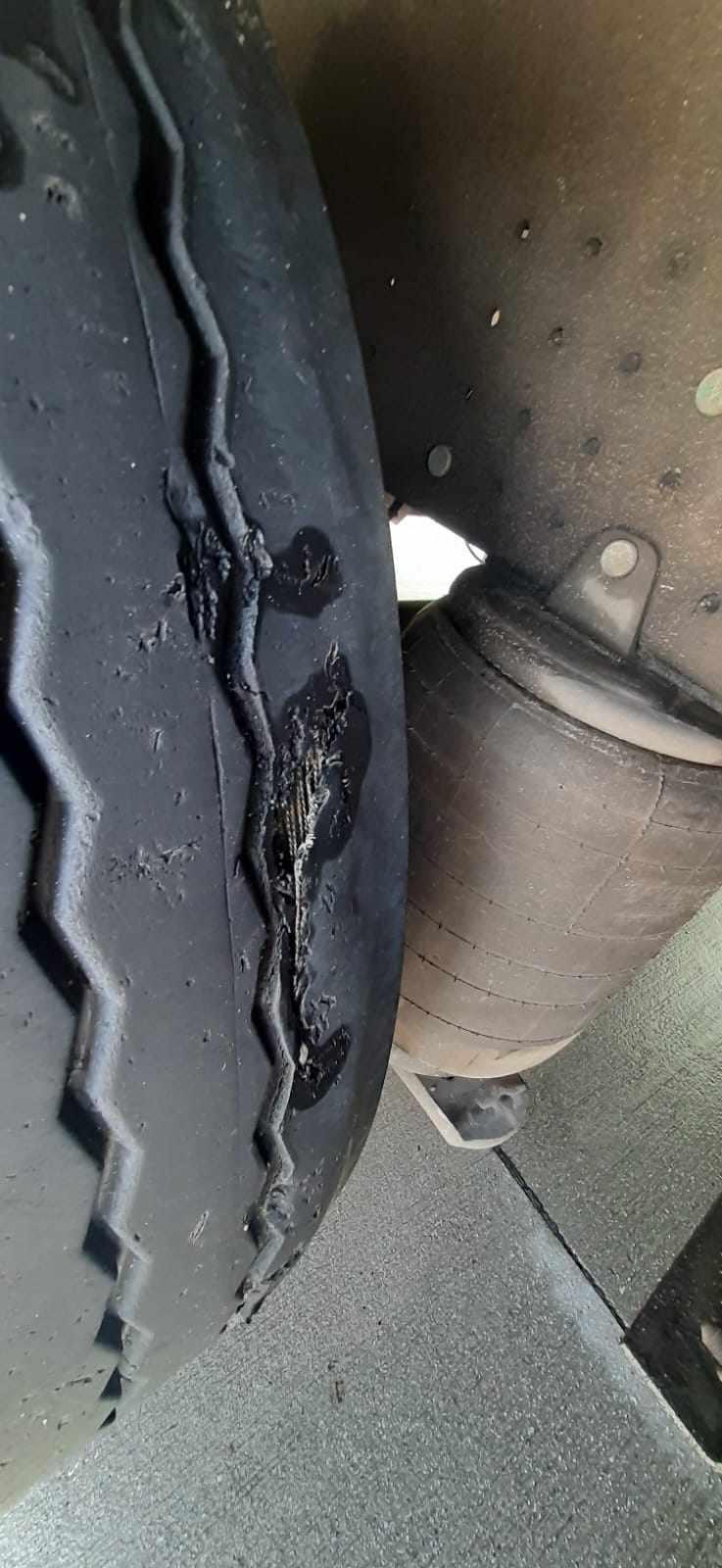 Kontrola stanu technicznego wykazała bardzo zły stan ogumienia naczepy. Opony na lewym i prawym kole pierwszej osi miały duże ubytki, odsłaniające stalowe opasanie. Uszkodzone opony groziły wystrzałem podczas jazdy. Stwierdzona usterka zagrażała bezpieczeństwu w ruchu drogowym.