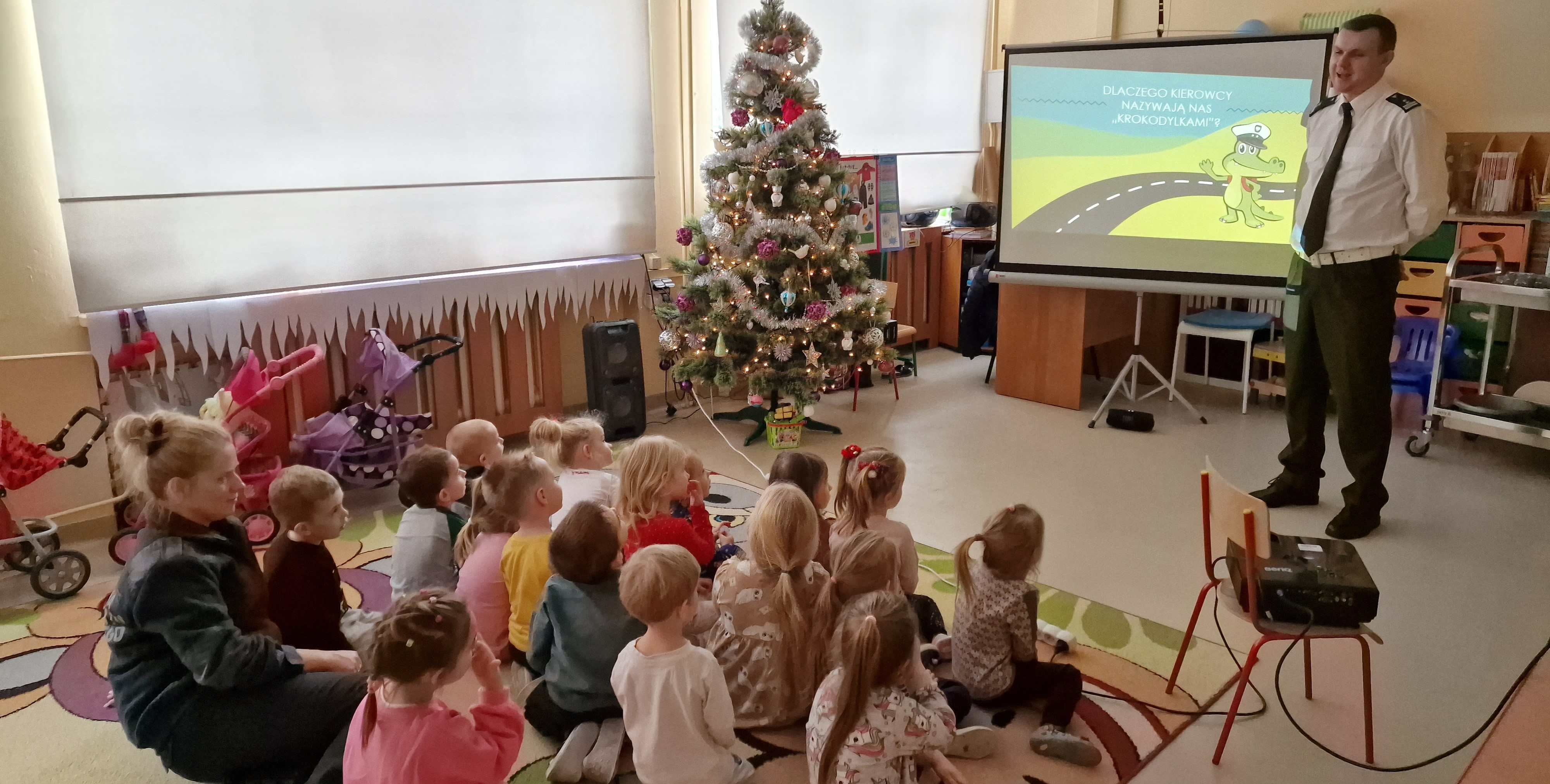 We wtorek (20 grudnia), grupa przedszkolaków z Publicznego Przedszkola nr 21 w Radomiu miała okazję uczestniczyć w niecodziennych zajęciach. Maluchów odwiedzili inspektorzy z mazowieckiej Inspekcji Transportu Drogowego. W ramach realizowanego projektu „Bezpieczna Szkoła Krokodylka Tirka", omówili najważniejsze zagadnienia związane z bezpiecznym poruszaniem się po drogach i w ich okolicy. Maluchy z zainteresowaniem obejrzały przygotowaną dla nich prezentację multimedialną i chętnie odpowiadały na pytania dotyczące przepisów ruchu drogowego. Nie lada atrakcją była także możliwość obejrzenia od środka inspekcyjnego furgonu z wyposażeniem do kontroli pojazdów. Dzieci chętnie przymierzały też elementy inspekcyjnego umundurowania. Na koniec spotkania otrzymały od inspektorów odblaskowe upominki, które poprawią ich widoczność na drodze.