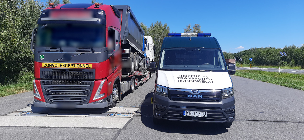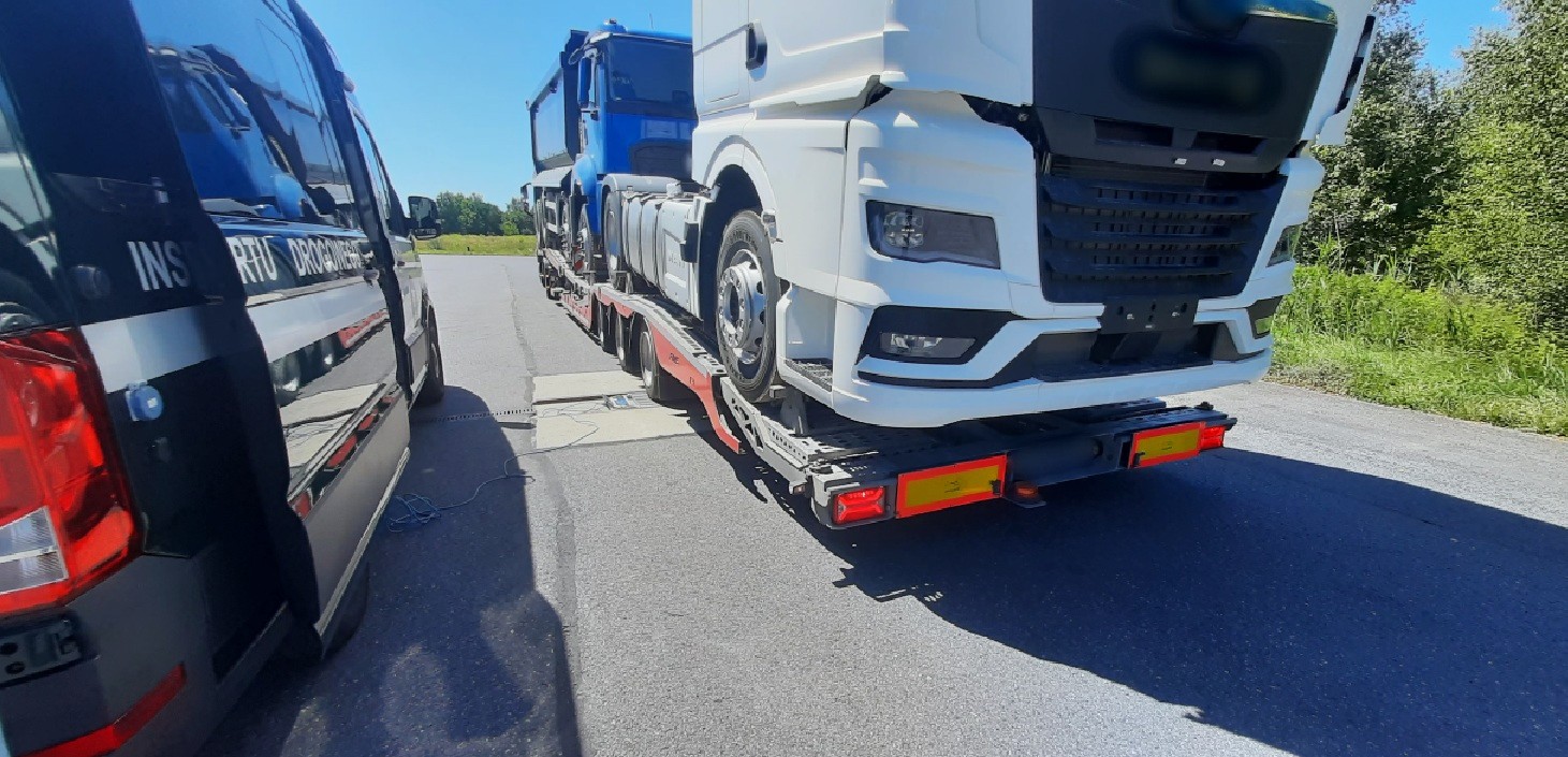 We wtorek (1 lipca), na ekspresowej „ósemce” w pobliżu Grodziska Mazowieckiego, inspektorzy ITD zatrzymali również ciągnik siodłowy z naczepą niskopodwoziową. Zestaw należy do polskiej firmy transportowej i kierował nim obywatel Polski. W momencie interwencji wykonywał międzynarodowy przewóz dwóch samochodów ciężarowych ze Słowenii do Polski. Funkcjonariusze postanowili zweryfikować m.in. parametry wagowe i wymiary zespołu pojazdów.