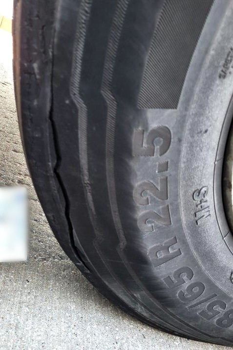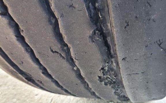 Kontrola stanu technicznego naczepy wykazała usterkę zagrażającą bezpieczeństwu ruchu drogowego. Opona znajdująca się na prawym kole pierwszej osi pojazdu była znacznie uszkodzona. Głębokie przecięcia odsłaniały stalowy kord opony. Dalsze jej użytkowanie groziło wystrzałem w trakcie jazdy. Oprócz tego na desce rozdzielczej samochodu ciężarowego wyświetlała się kontrolka informująca o usterce systemu zapobiegającego blokowaniu kół podczas hamowania - ABS.
