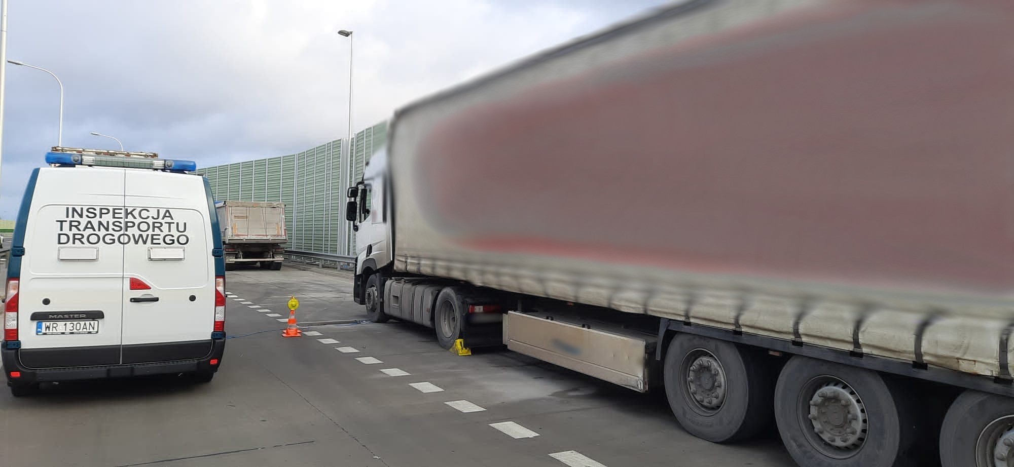 Inspektorzy zatrzymali i skierowali na przenośne wagi również ciągnik siodłowy z podpiętą naczepą, którym przewożono za dużo podmurówek betonowych do ogrodzeń. Zestaw z ładunkiem ważył 43,7 t zamiast dopuszczalnych 40 t. Za duża masa ładunku spowodowała też przekroczenia dozwolonych nacisków grupy osi naczepy na drogę o 2,5 t. Naciski wynosiły 26,5 t zamiast przepisowych 24 t.