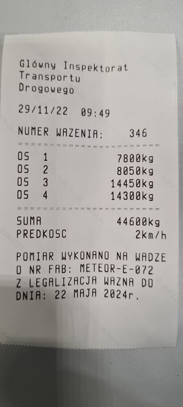 Na miejscu przeprowadzono kontrole ważeniową kontrolowanego pojazdu. W wyniku przeprowadzonej kontroli stwierdzono, że rzeczywista masa wywrotki wyniosła ponad 44 tony co do normy 32 tony, co stanowiło poważne przekroczenie dopuszczalnej masy całkowitej. Ponadto stwierdzono, przekroczenie dopuszczalnej wartość nacisku na podwójnej osi o ponad 9 ton.